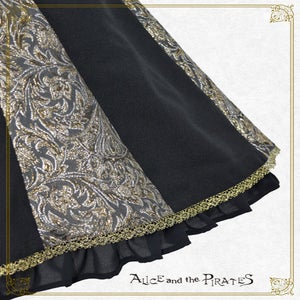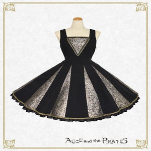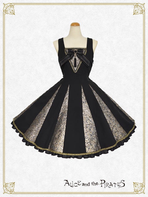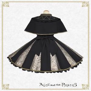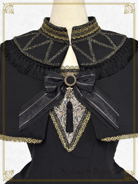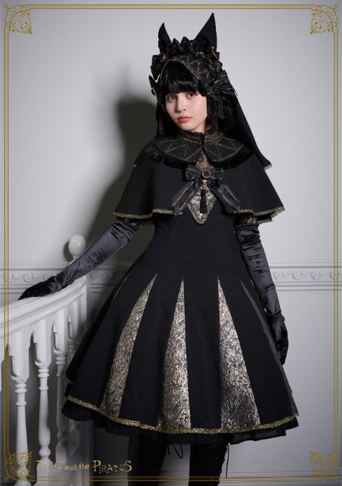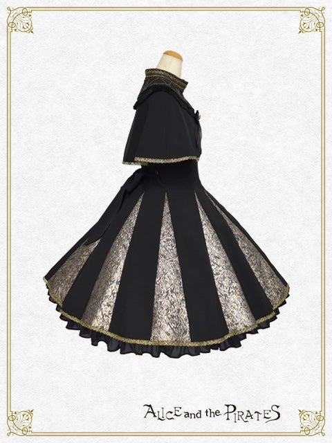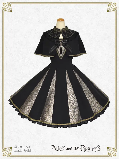 黒地にオーナメントラメジャガードの生地を組み合わせたジャンパースカートと、タッセルフリンジやラメトーションレ―スが美しい半立ち襟ケープとのセットは