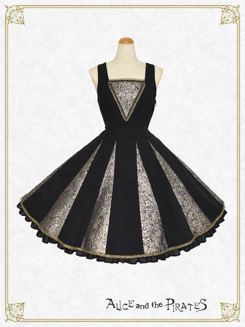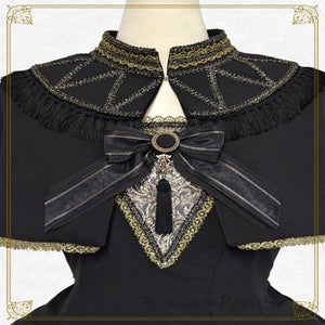 This set includes a jumperskirt made of a black background with ornamental glitter jacquard fabric, and a half stand-up collar cape with beautiful tassel fringe and glitter torchon lace.