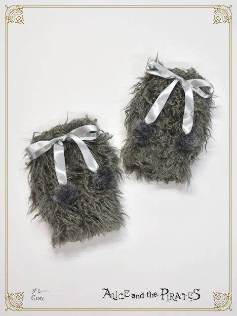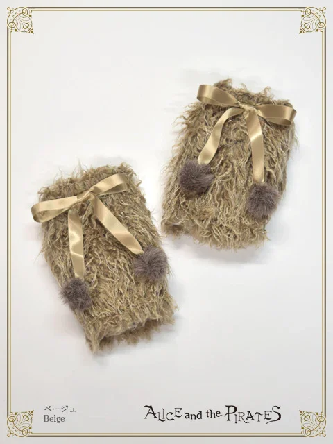 両側ゴム入り・親指穴開き仕様で、フェイクファーのポンポン付きおリボンを結んでお召し頂けます。