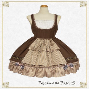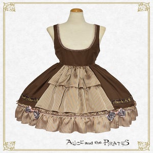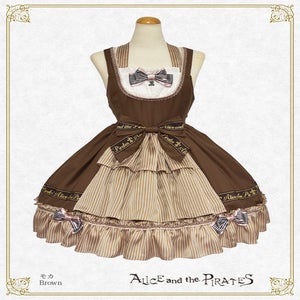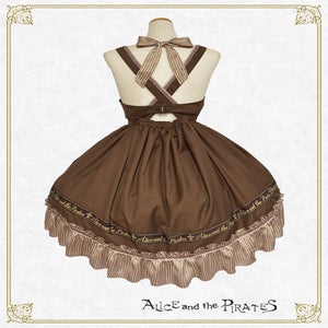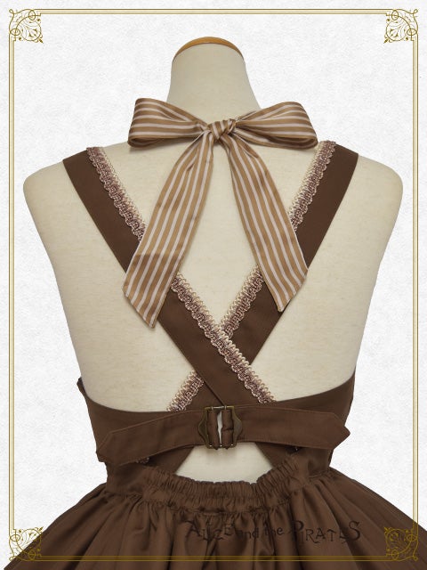 渋めの土台色に映える、まるでトッピングのように配置された可愛らしいピンクやミントのおリボンが目を引くジャンパースカートは前フリルと裾フリル部分、首後ろで結んで頂くホルター紐部分に使用されたサテンストライプ地が軽やかな雰囲気を感じさせます♥