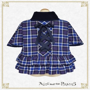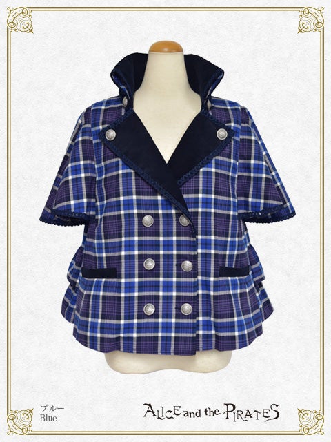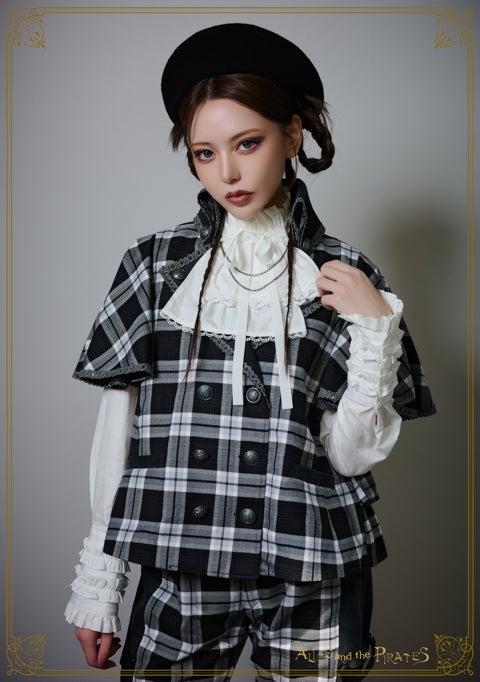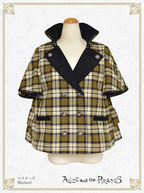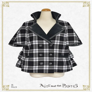 The jacket features striking cape-design sleeves and a combination of cordoroy fabric for a seasonal feel; and the back is also decorated with a lace-up ribbon and two-tiered ruffles for a unique look.