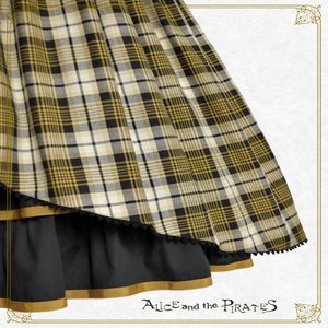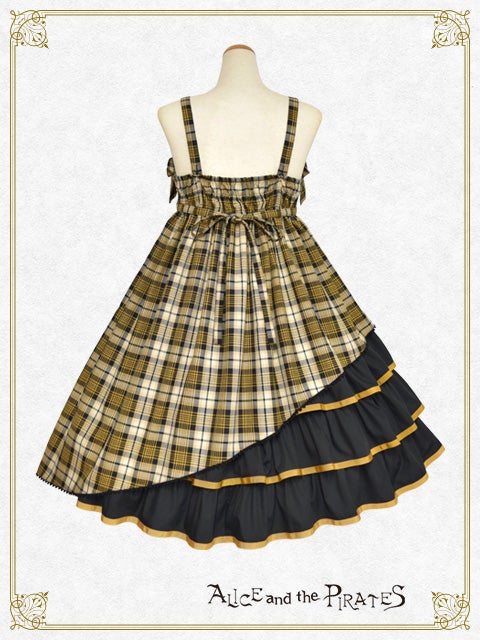 The asymmetrical overskirt and jumperskirt feature eye-catching three-tiered ruffles with contrasting ribbon tape at the hem, and the shirred back makes for a comfortable fit.
