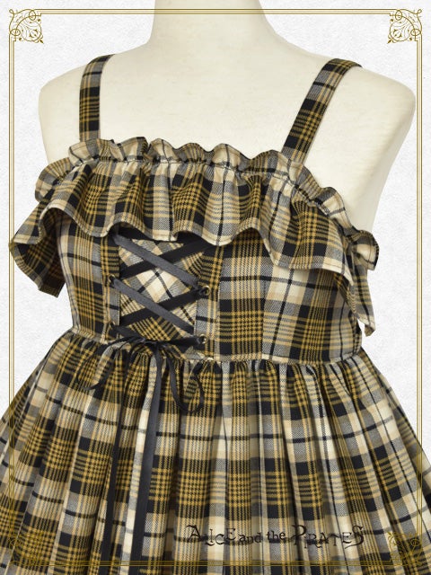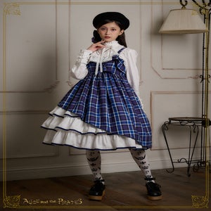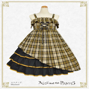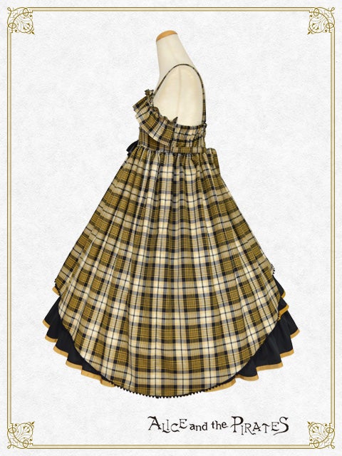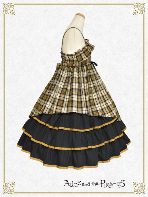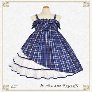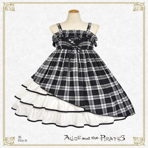 アシンメトリーなオーバースカートと、裾に配色のリボンテープをあしらった3段フリルが目を惹くジャンパースカートは、