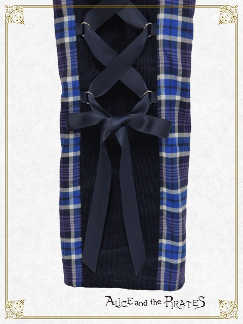 -blue x navy corduroy x silver buttons/hardware x navy ribbon