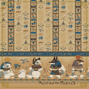 古代エジプトにまつわるたくさんのモチーフ絵、ヒエログリフに当て嵌めた「ALICE and the PIRATES」のアルファベット(聖刻文字)など色彩豊かな配色と 蓮の花の可愛らしさも、さりげないポイントです。