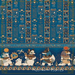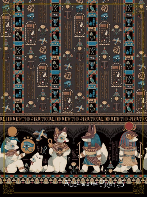 古代エジプトにまつわるたくさんのモチーフ絵、ヒエログリフに当て嵌めた「ALICE and the PIRATES」のアルファベット(聖刻文字)など色彩豊かな配色と 蓮の花の可愛らしさも、さりげないポイントです。