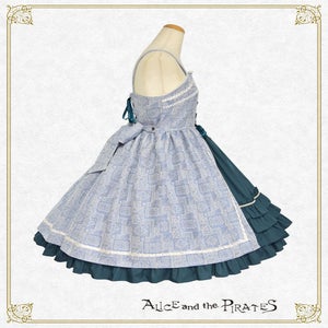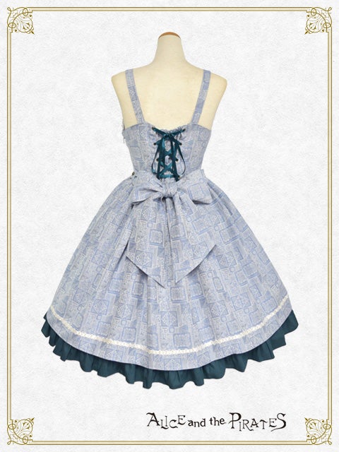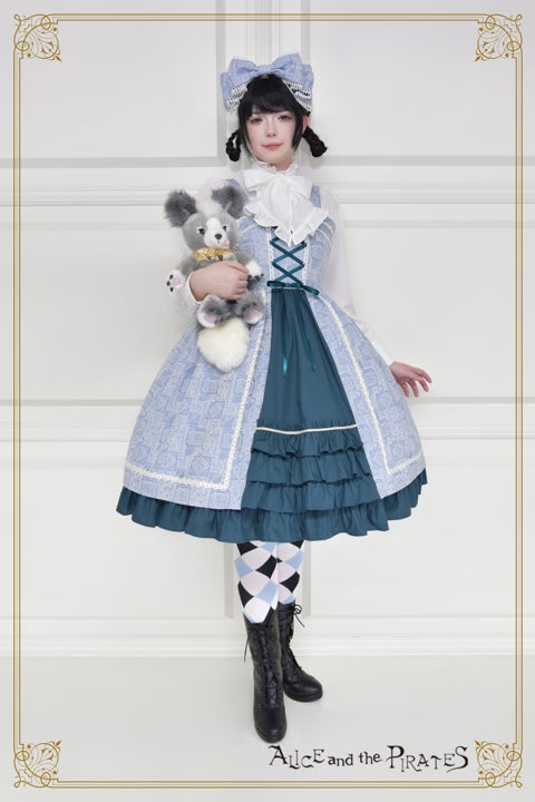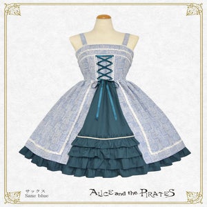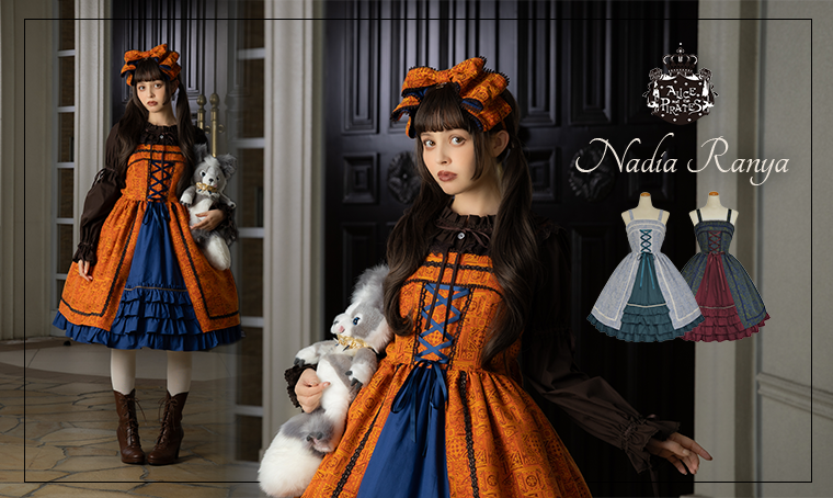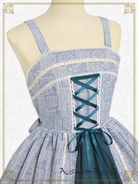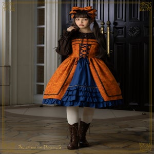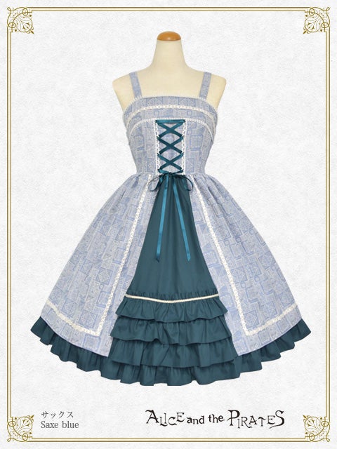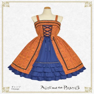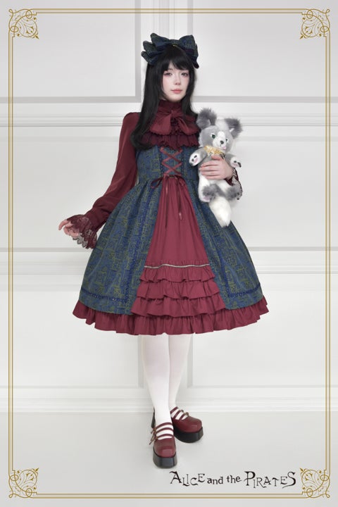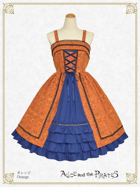 オリエンタルな壁画風のゴブラン調ジャガード織生地がアンティークな印象のジャンパースカートは、配色の前中心スカート・裾フリルとの鮮やかなコントラストが豪奢な雰囲気を演出します。