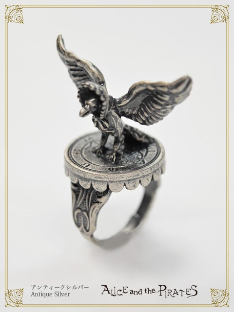 羽根を広げたラウムの姿と、印章入りの円形の台座が目を引くリングは、同シリーズの鳥籠の中に嵌め込める仕様となっております。