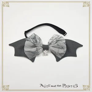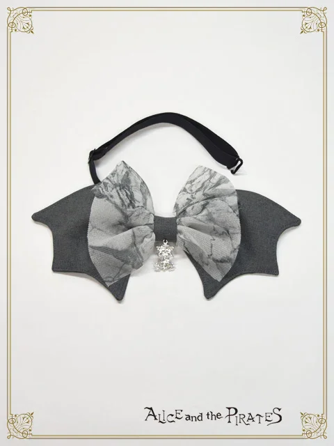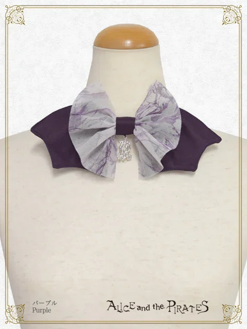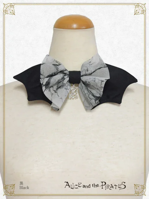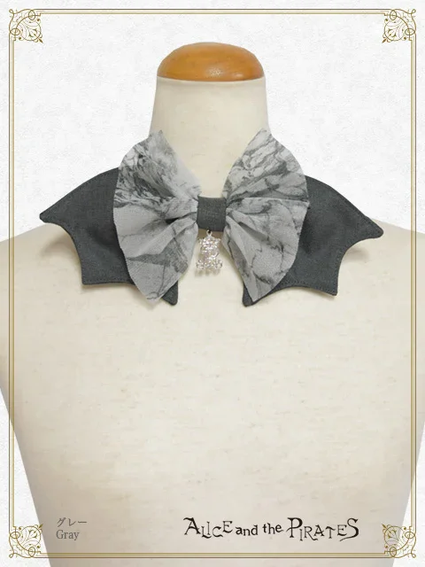 蝙蝠が羽根を広げたようなデザインのタイは、お首の後ろでパーツを留めて頂くだけで着脱でき、留め紐の長さはアジャスターで調整が可能です。