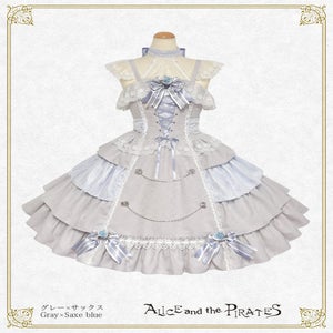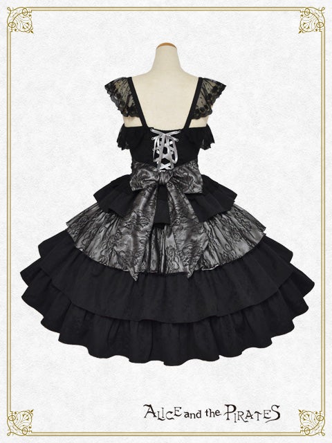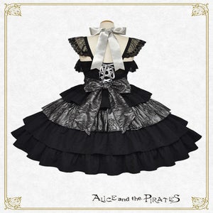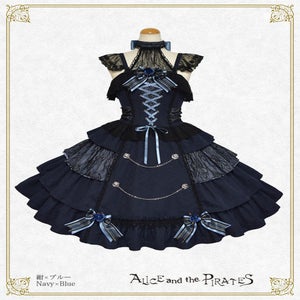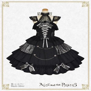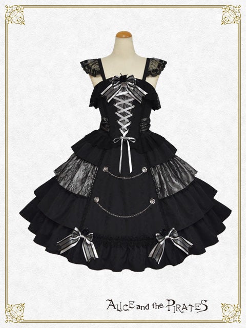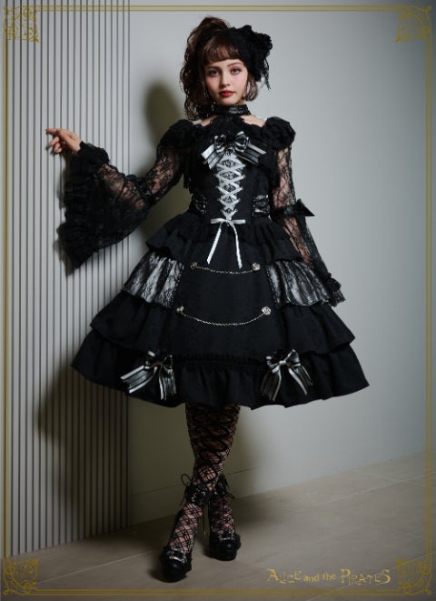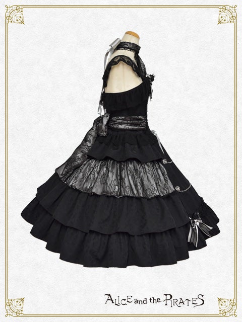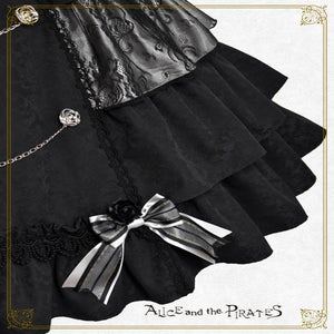 This jumperskirt is made from a combination of thick jacquard fabric, satin, and lace; and features a tiered skirt, rose buttons combined with chains, a bodice with boning, and a removable lace bib; all of which are typical Pirates designs. It's a special piece that truly symbolizes Pirates♪