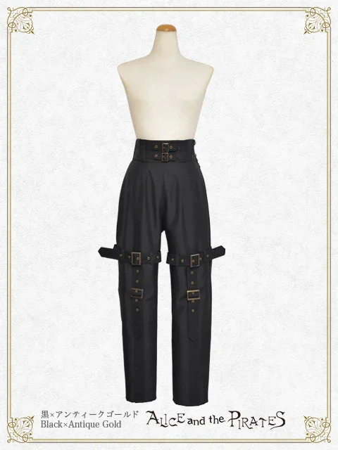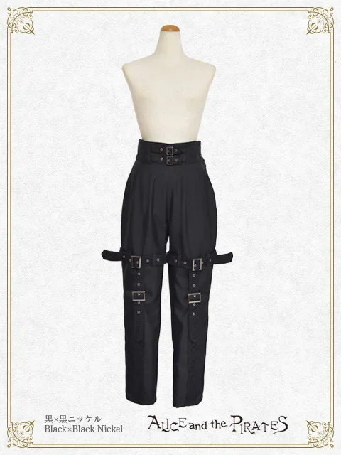 膝上から裾に向かってあしらわれたレース地を重ねたベルト装飾が特徴的なロングパンツは、ウエスト部分の二重のバックルベルトがさりげないアクセントとなり、まるで誇り高く戦う気高い騎士のよう…。