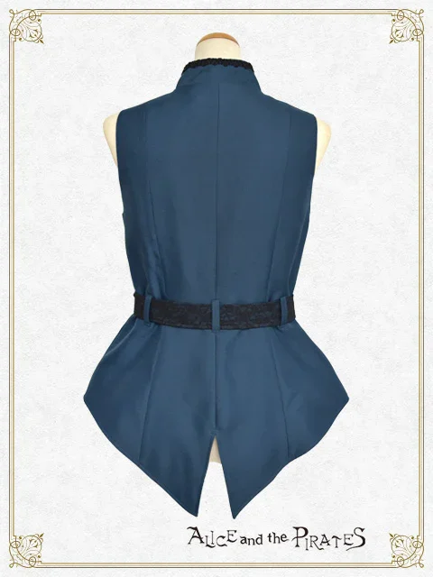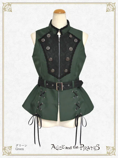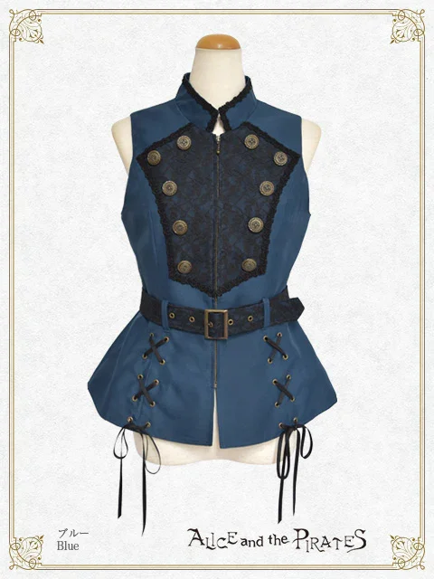 前中心オープンファスナー仕様のベストは、胸元にあしたわれた盾を思わせるレース地重ねのデザインがポイント。