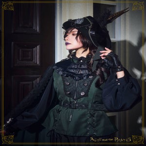 -green x black lace x black nickel metal fittings/buttons x black ribbon