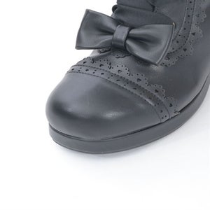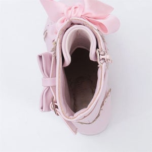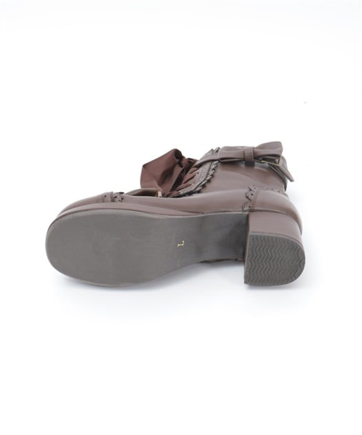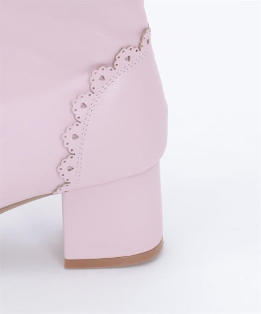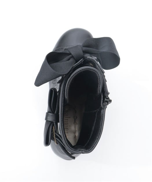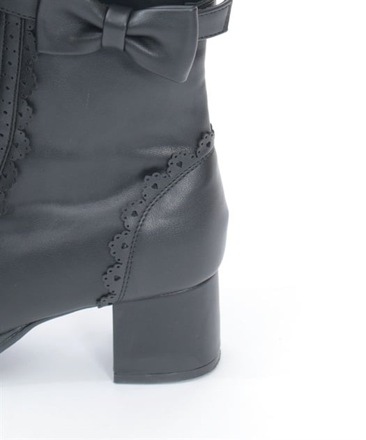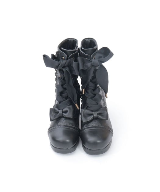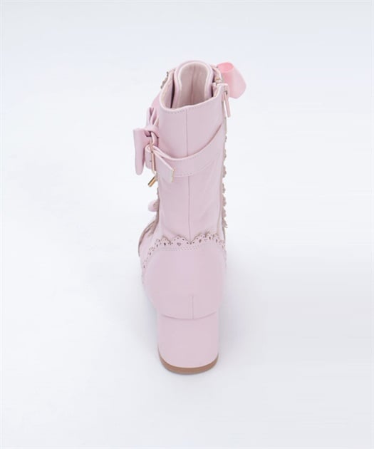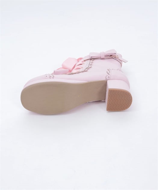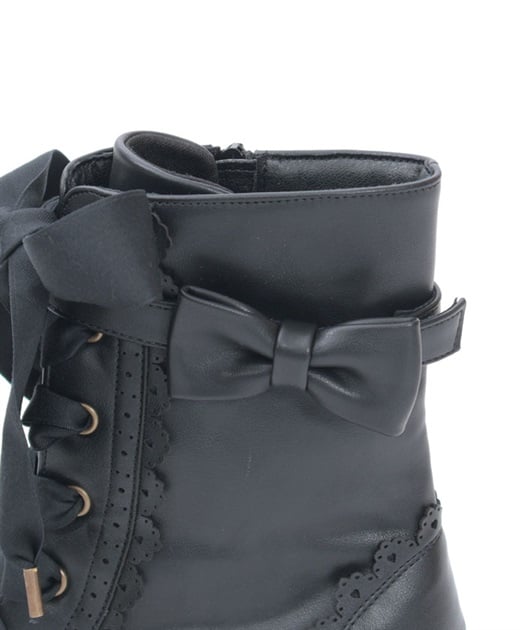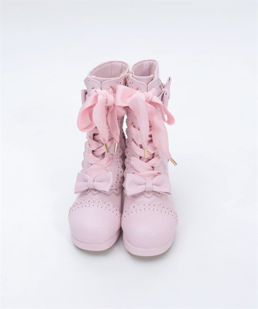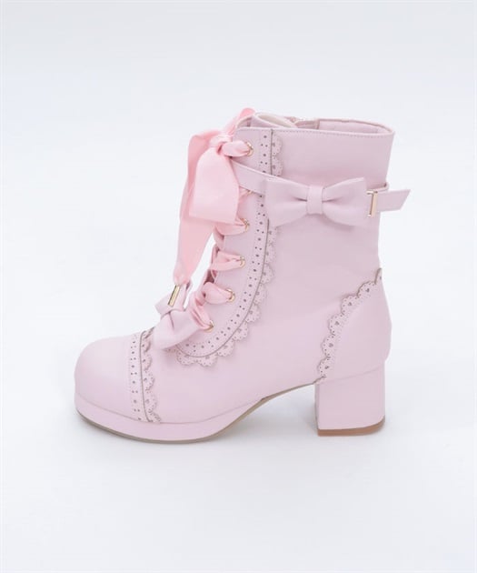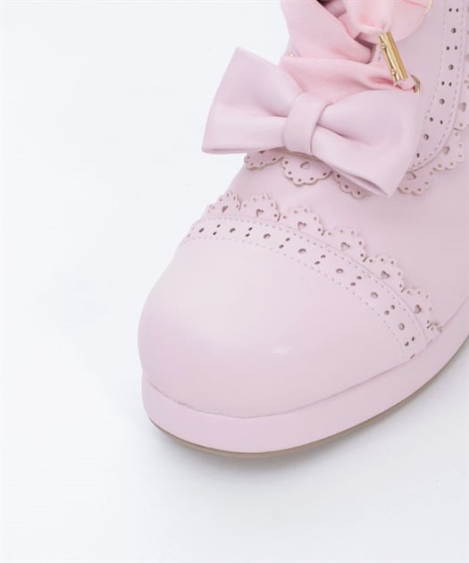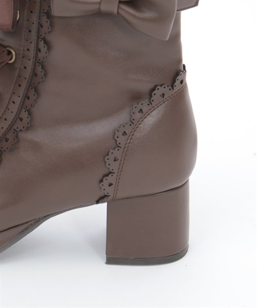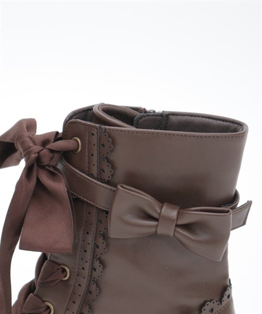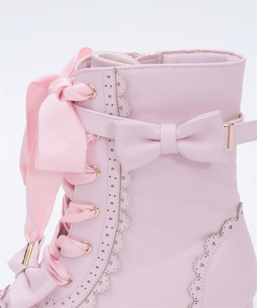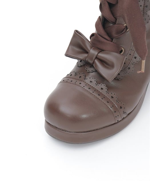 さりげなくハート型のパンチングを施した可愛いデザイン。レースアップやリボンをたくさん盛り込んだシャルミエールのお洋服にぴったりのブーツです。茶色、黒の定番カラーに加えて、パステルカラーのコーデにぴったりなピンクが登場!内側のファスナーで楽々着脱ができます。