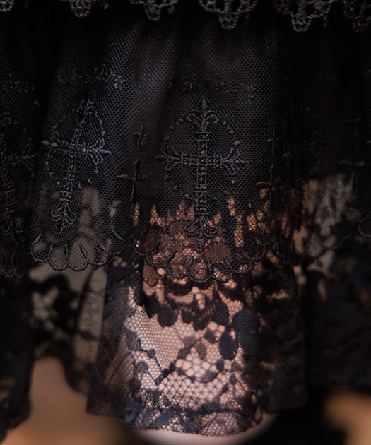 The original cross-motif tulle lace features the Chalmiere logo. The lace frills and voluminous two-tiered frills are its highlights.