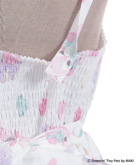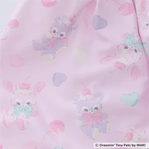 イラストレーターMAKI描き下ろしのイラストを使用したスペシャルコラボレーションアイテムが登場!描き下ろしイラストを使用したジャンパースカートです。ぬいぐるみのクマやうさぎ、チェリーやシュガーハーツをちりばめたファンシーで可愛いオリジナルプリントです。裾にフリルをあしらった可愛らしいデザイン。胸元がシンプルなので様々なブラウスが合わせやすいデザインです。通年通して着用できる素材感となっています。