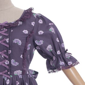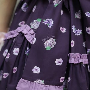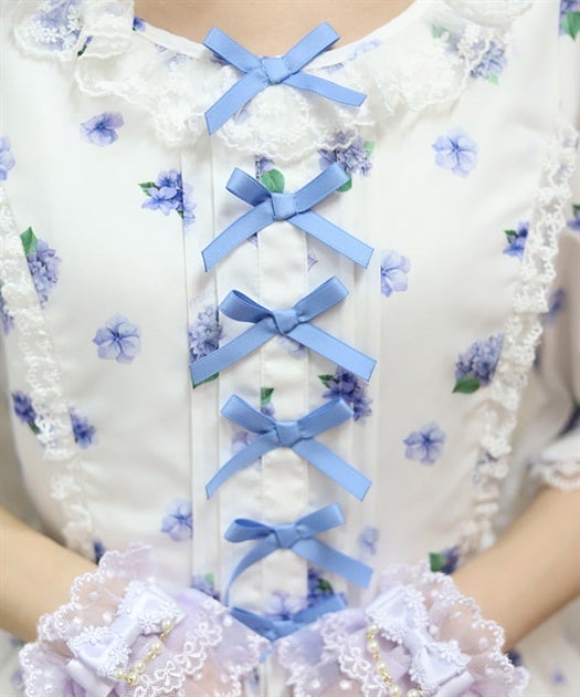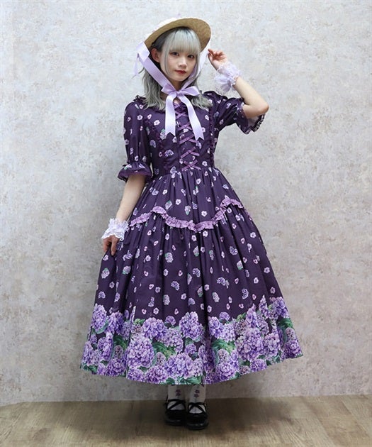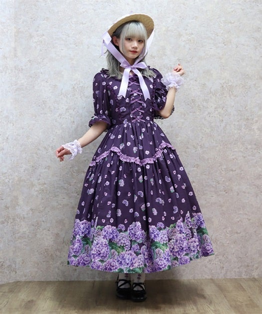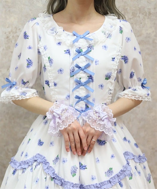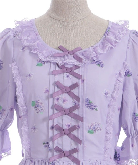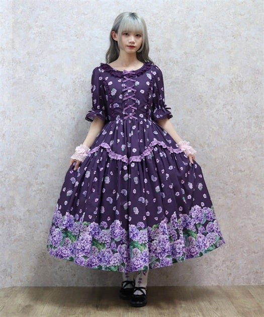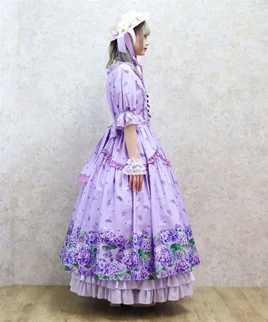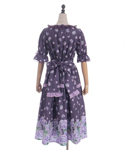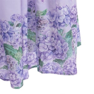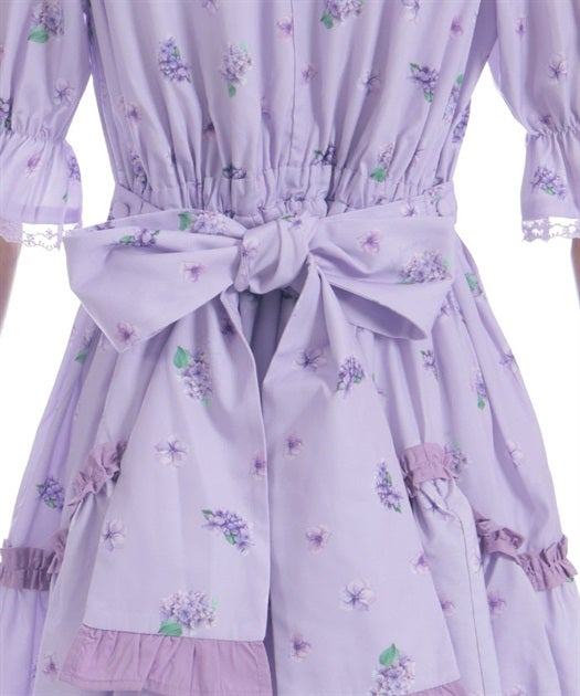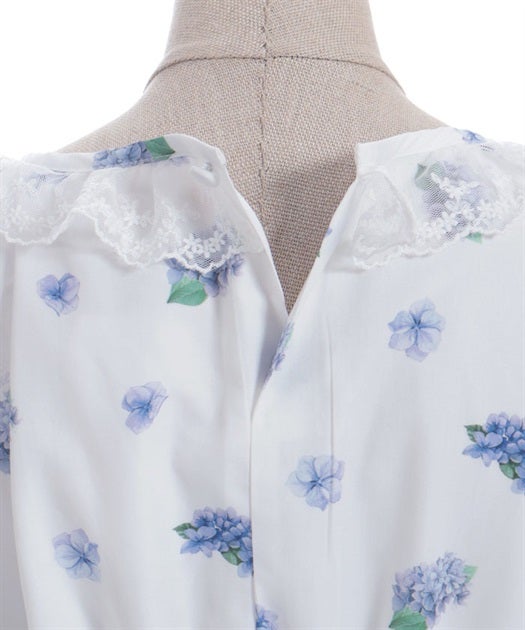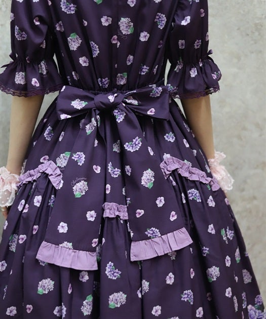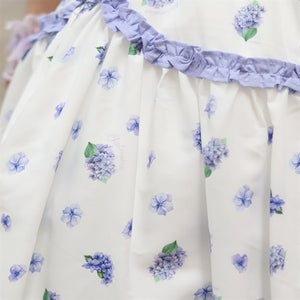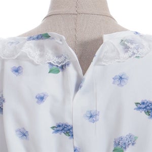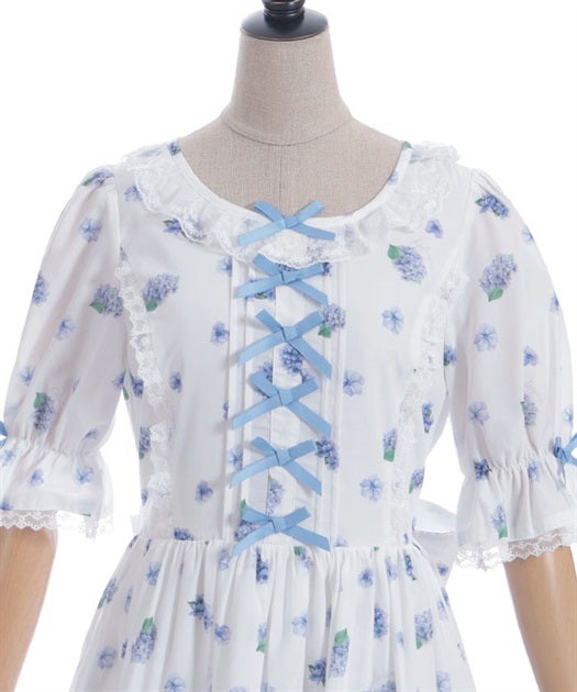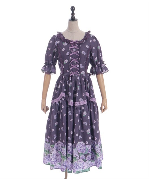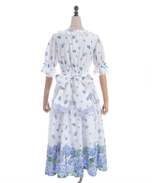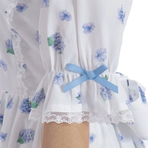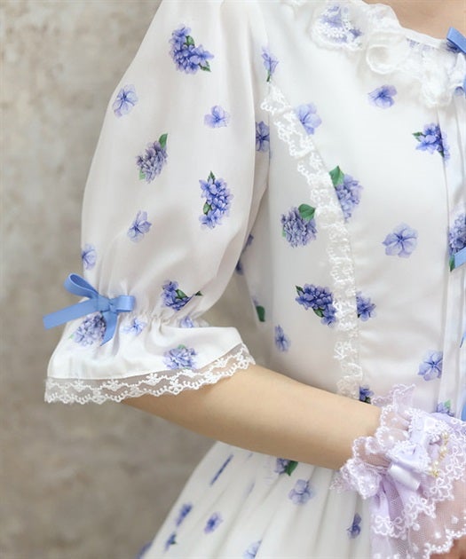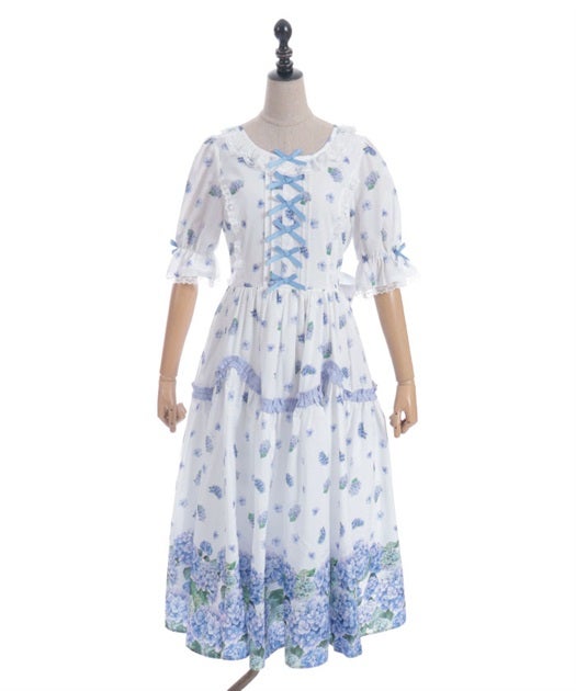 A classical and cute short-sleeved dress with a painting-esque hydrangea pattern.