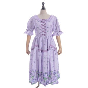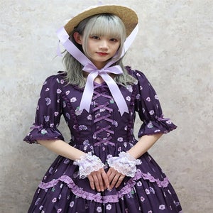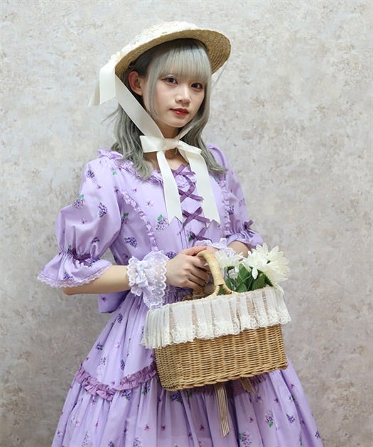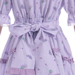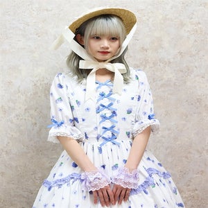 This dress gives a breezy feel with its refreshing open collar, further decorated with several little ribbons down the center front. The scalloped frills on the skirt add a subtle cuteness.
