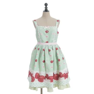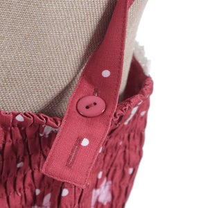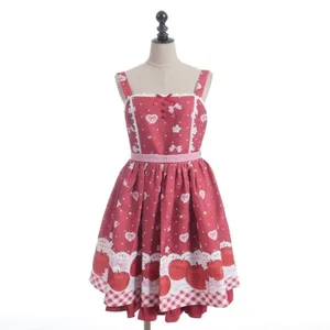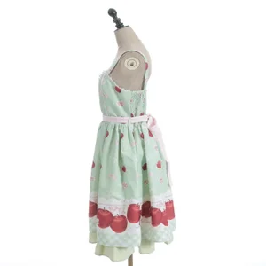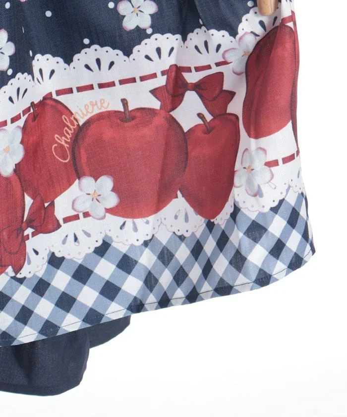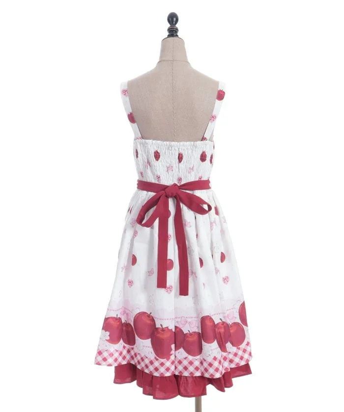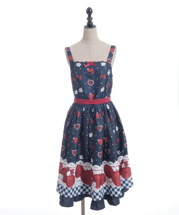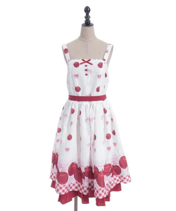 This jumper skirt features subtle mini ribbons and wrapped buttons on the chest. The waist ribbon is detachable. The back side of the bodice is shirred.
