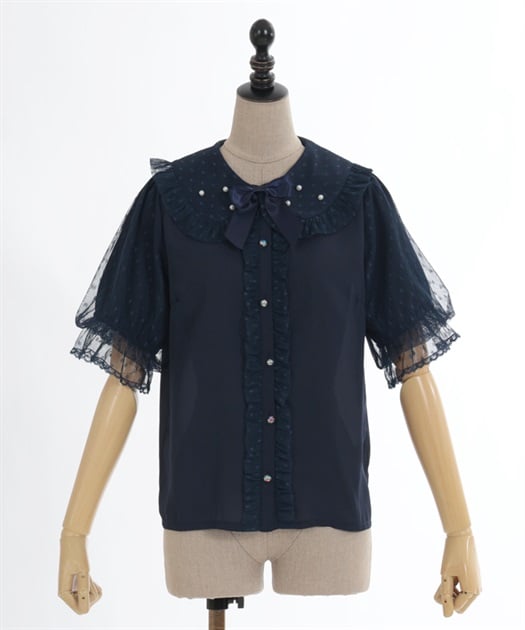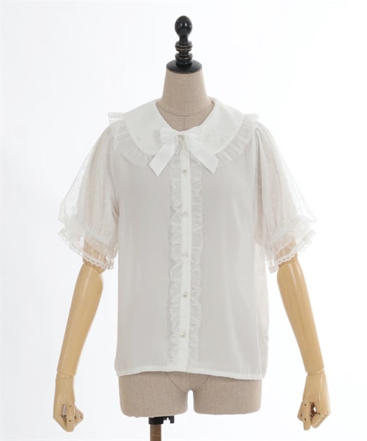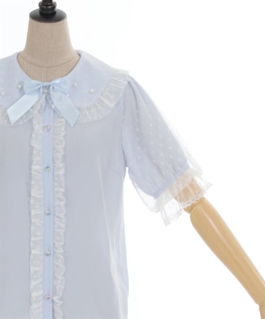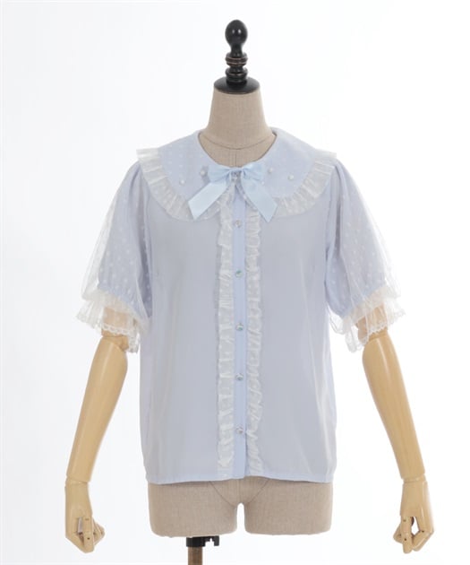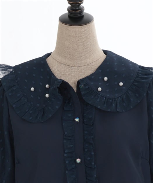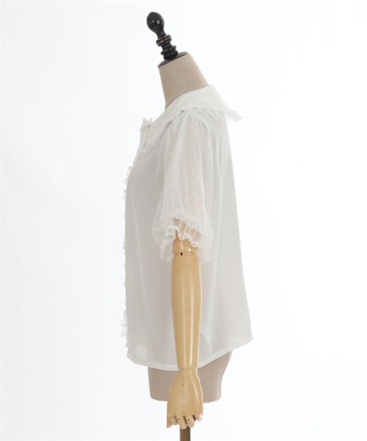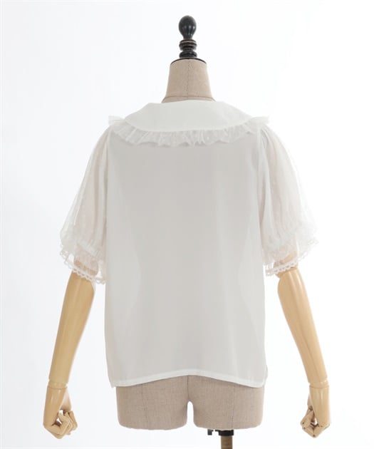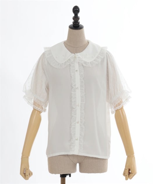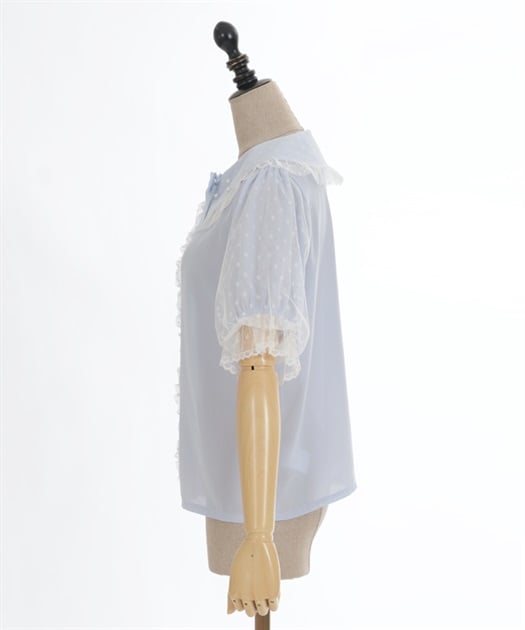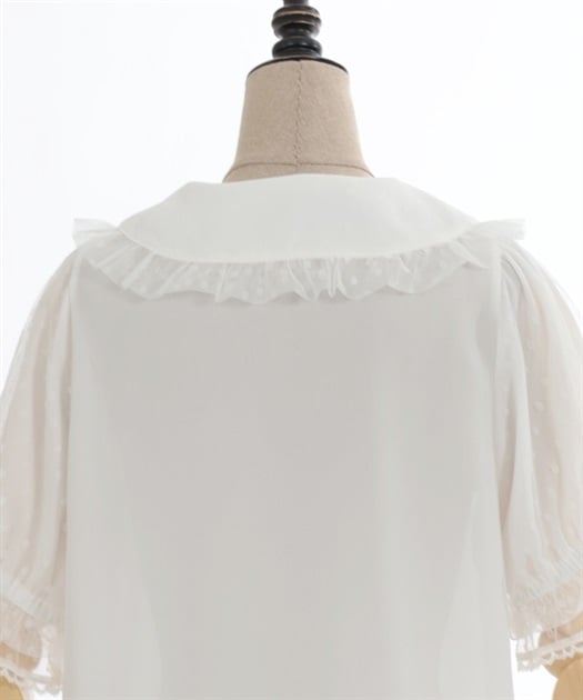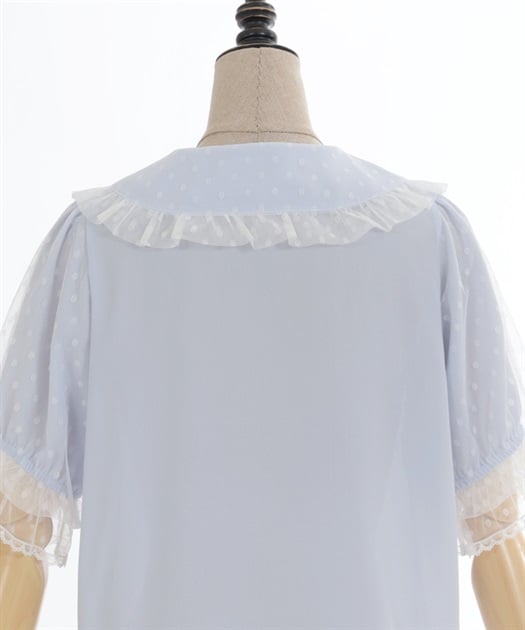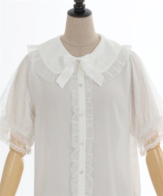 衿と袖にドットチュールを重ねた夏らしいブラウスです。シャボン玉のような釦がポイントです。