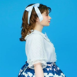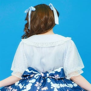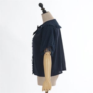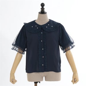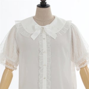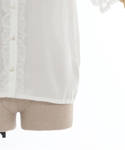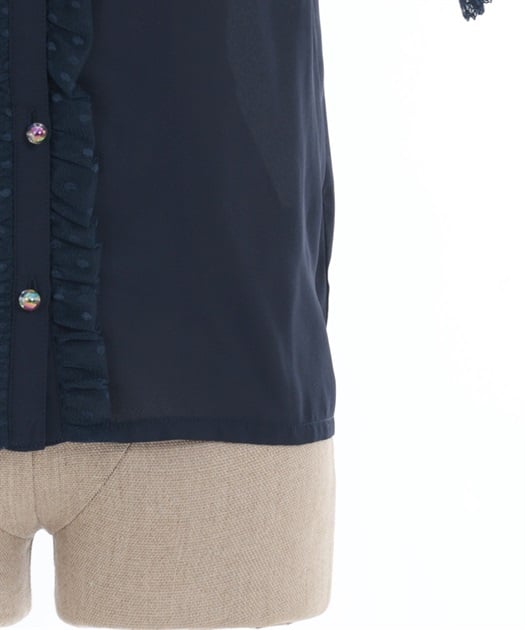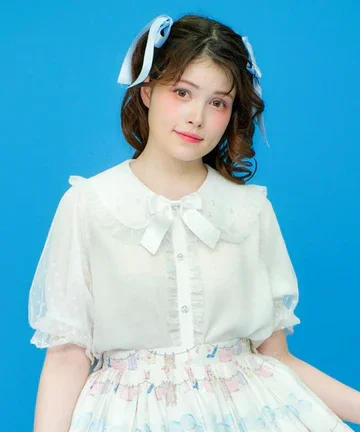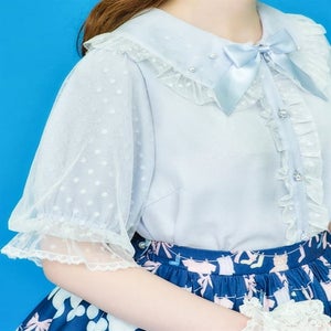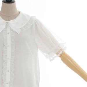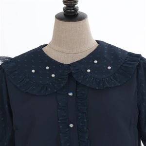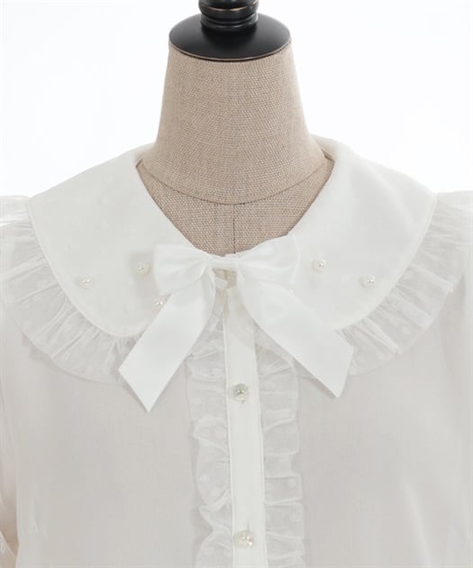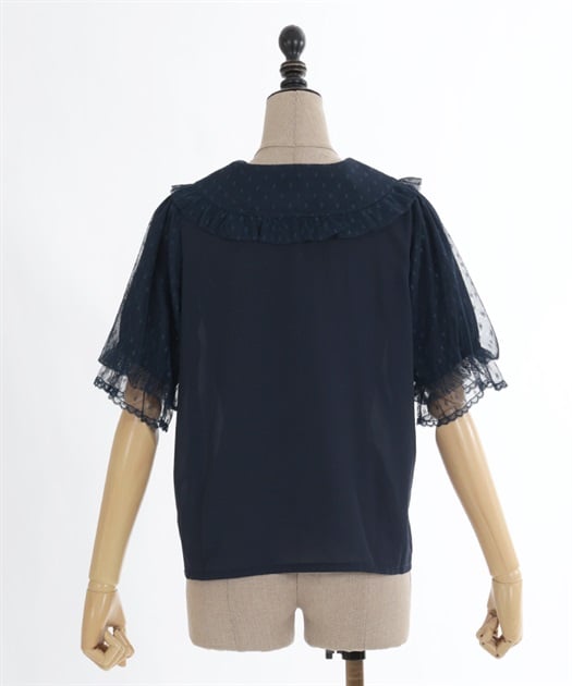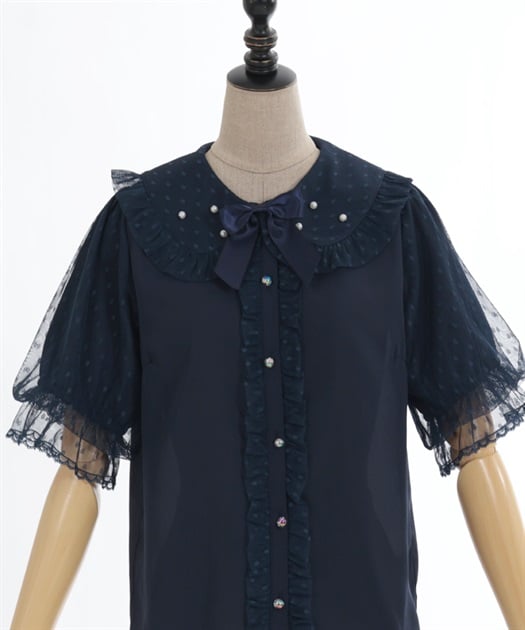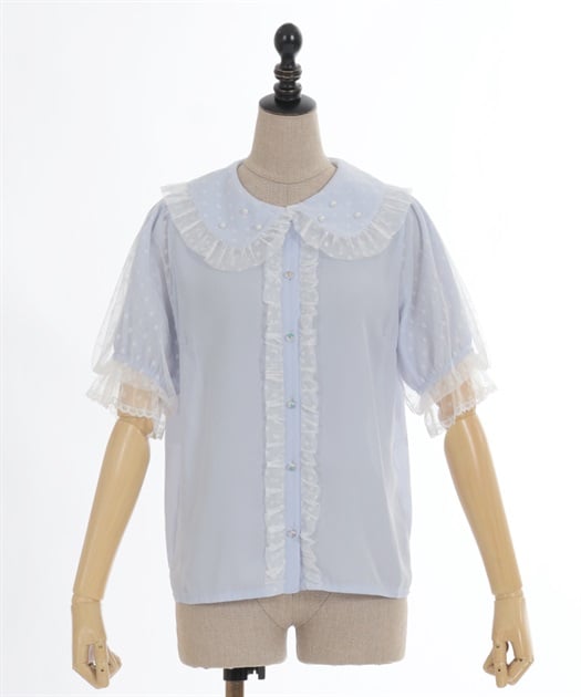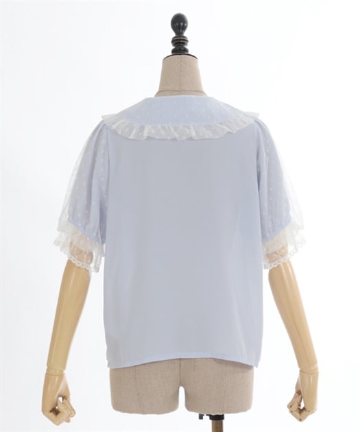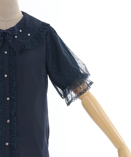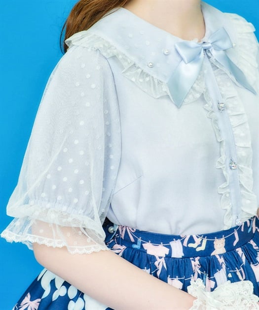 衿と袖にドットチュールを重ねた夏らしいブラウスです。シャボン玉のような釦がポイントです。