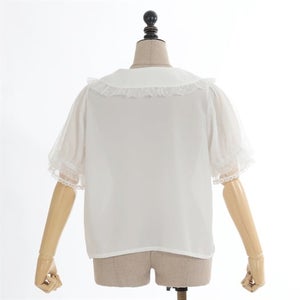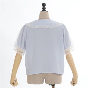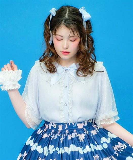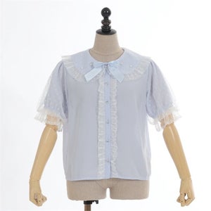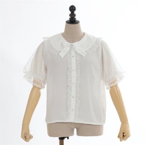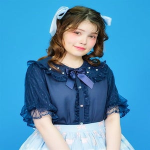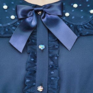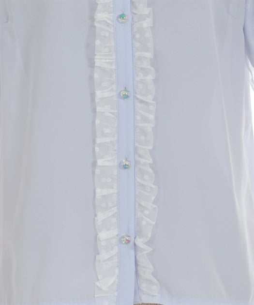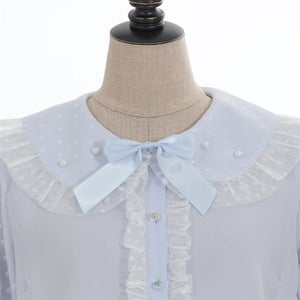 This summery blouse comes with layers of dot tulle on the collar and sleeves. Its key detail is its soap bubble-like bead buttons.