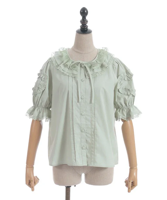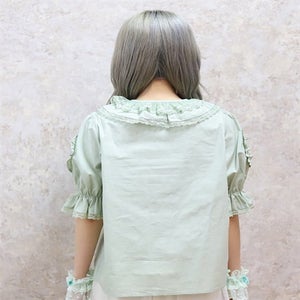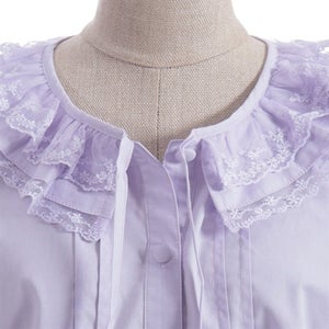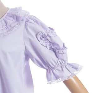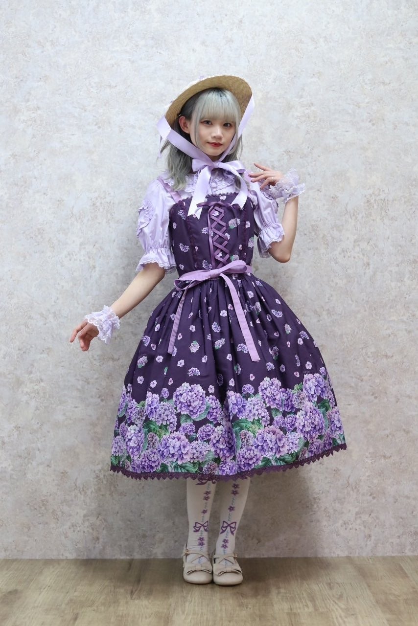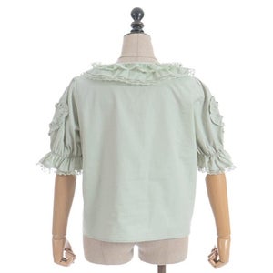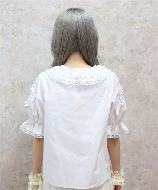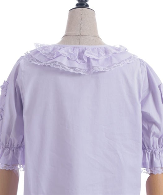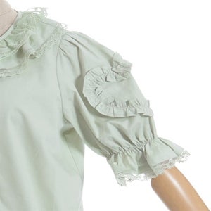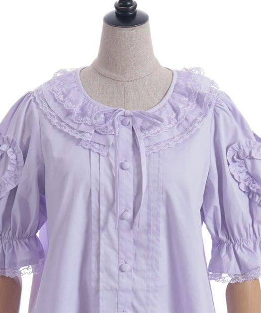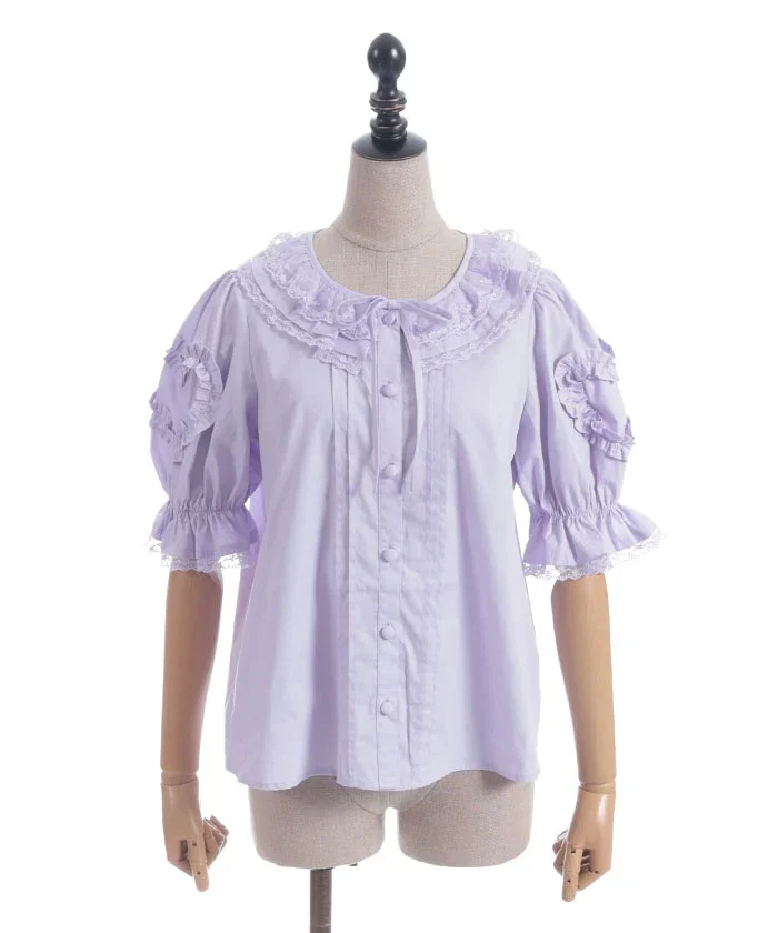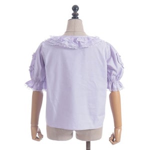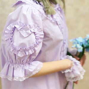 [Brand comment] This 100% cotton blouse is perfect for summer. It features a clean, open collar and heart-shaped ruffles on the sleeves. Available in three colors: classic white, lavender, which complements the hydrangea print, and green, perfect for a classic look. The cute design extends all the way to the hem, making it perfect not only as an inner layer for a jumper skirt, but also as a perfect complement to any skirt.
