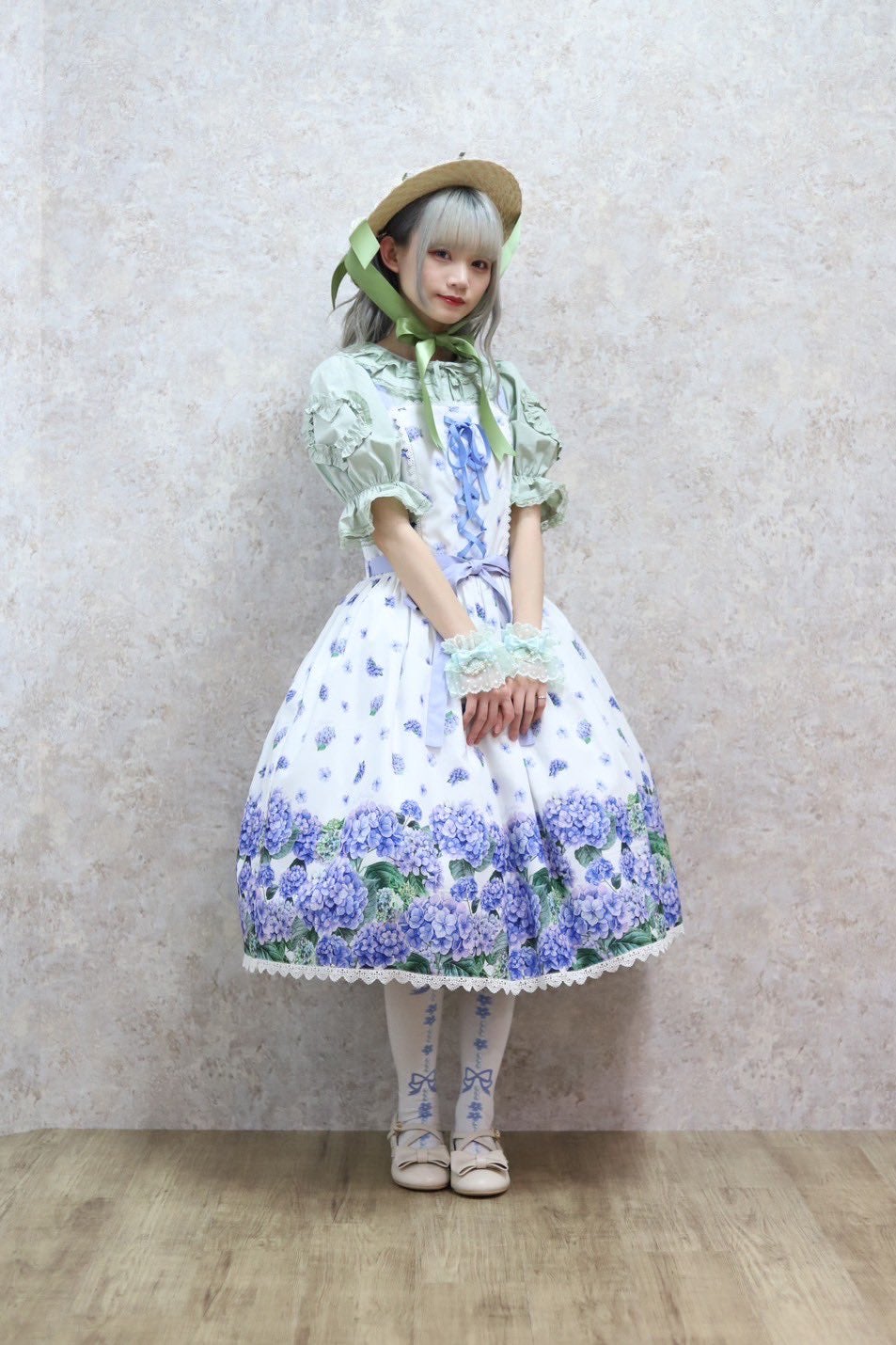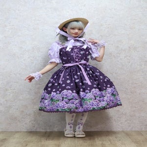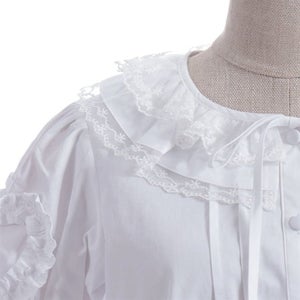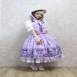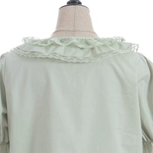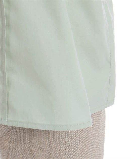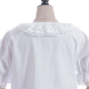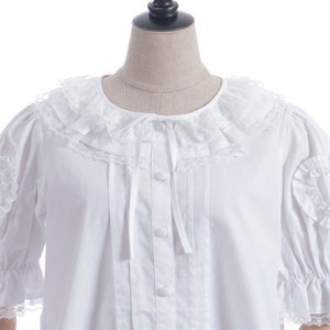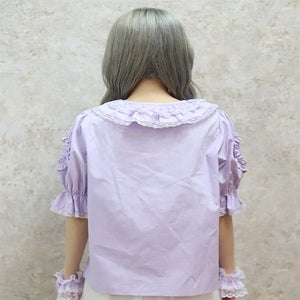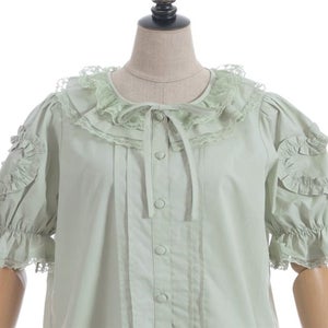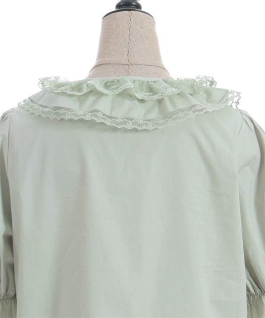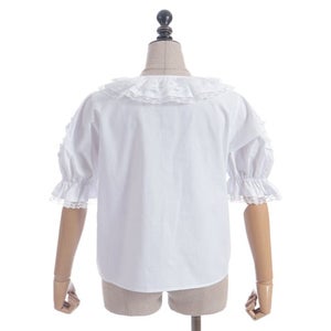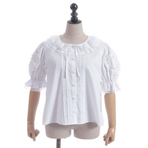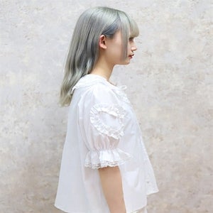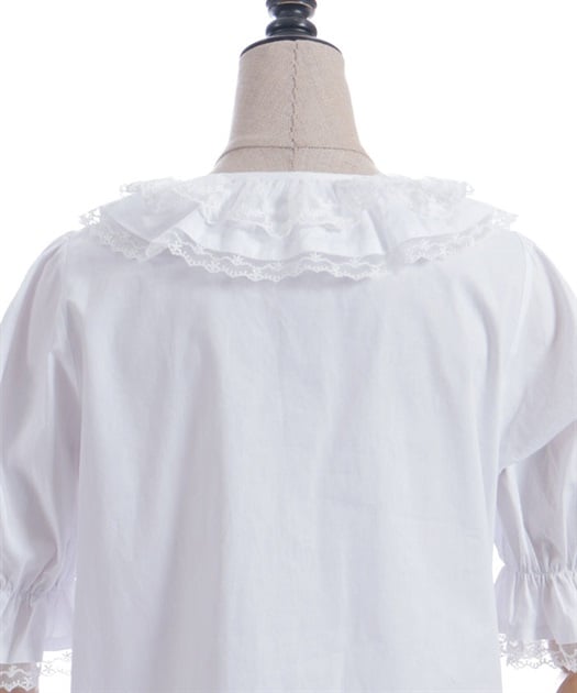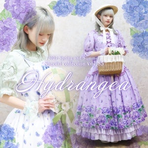 [Brand comment] This 100% cotton blouse is perfect for summer. It features a clean, open collar and heart-shaped ruffles on the sleeves. Available in three colors: classic white, lavender, which complements the hydrangea print, and green, perfect for a classic look. The cute design extends all the way to the hem, making it perfect not only as an inner layer for a jumper skirt, but also as a perfect complement to any skirt.