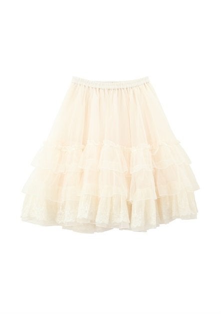 オーガンジーのティアードデザインでボリュームを出したパニエです。ワンピースやスカートの下に履くと、ふわっとしたシルエットにできます。裾のネコ柄レースがポイントです。