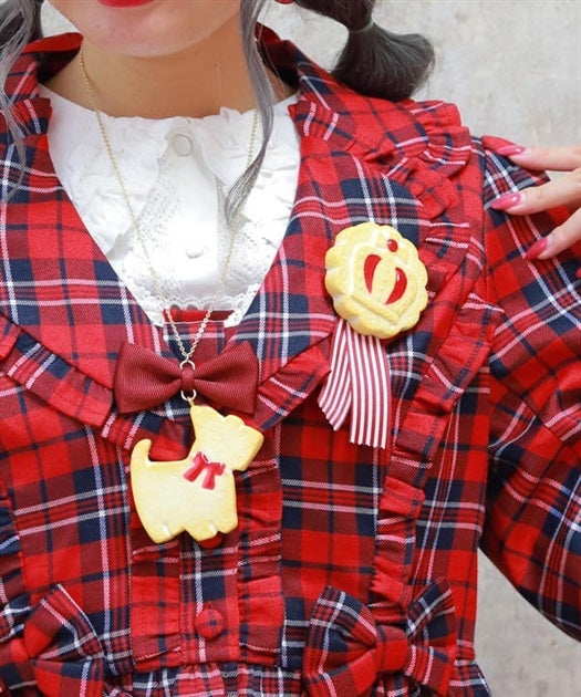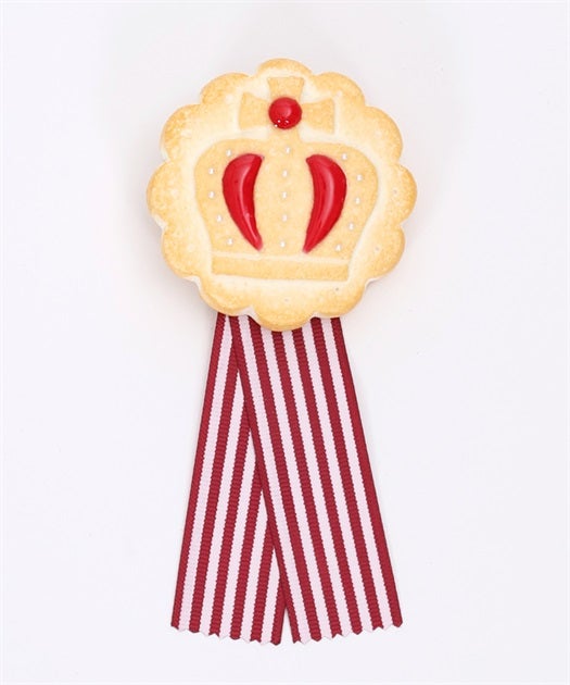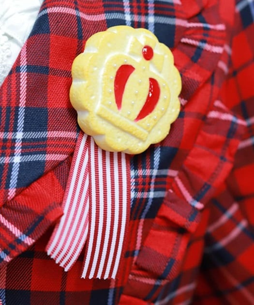 Inspired by tartan clothing, this rosette crown brooch is modeled after shortbread, a famous British sweet.