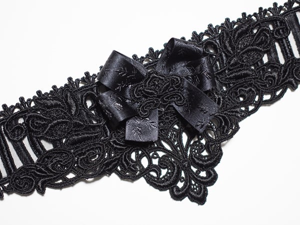 オーガンジーリボンを通した梯子レースに薔薇のモチーフレース、リボンを飾った豪華で可愛らしいチョーカーです。