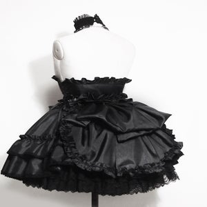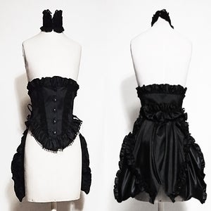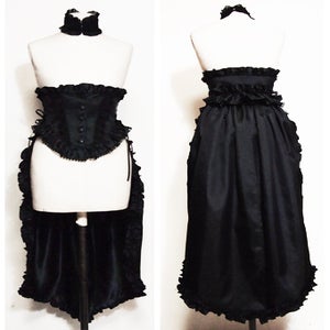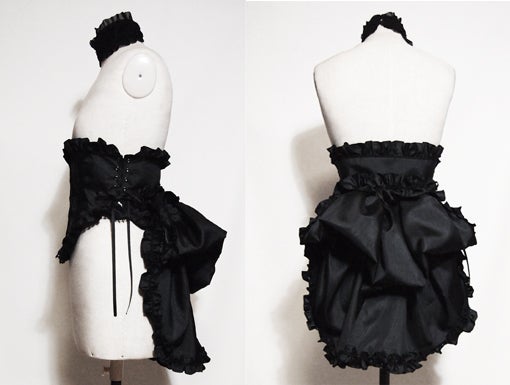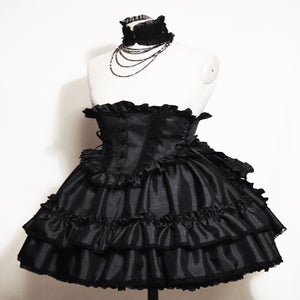 Weight: 215g シルキーシャンタンのバッスル付のショートコルセット。 サイドはハトメとリボンで編み上げを、バッスルはウエスト部分フリルの下にある輪に通してお好きなボリュームでお楽しみ頂けます。 前面に2本のボーン入り。 サイドの編み上げを緩めれば多少のサイズ調整が可能です。 *チョーカーは商品に含まれません。 Short corset with silky shantung bustle. With ribbons laced up the side into eyelets, enjoy how much volume you like by bringing the waist frill up through a loop. There are two pieces of boning in the front. If you loosen the lacing on the side, some size adjustment is possible. *Choker is not included. 上から3分の2辺りを折って輪に通した形。 裾を輪に通した形。 バッスルを作らずにスカートに重ねて頂いても。 First picture: Folded 2/3 from the top through the loop. Second picture: Hem folded through the loop. Third picture: If you layer it over the skirt without making a bustle.