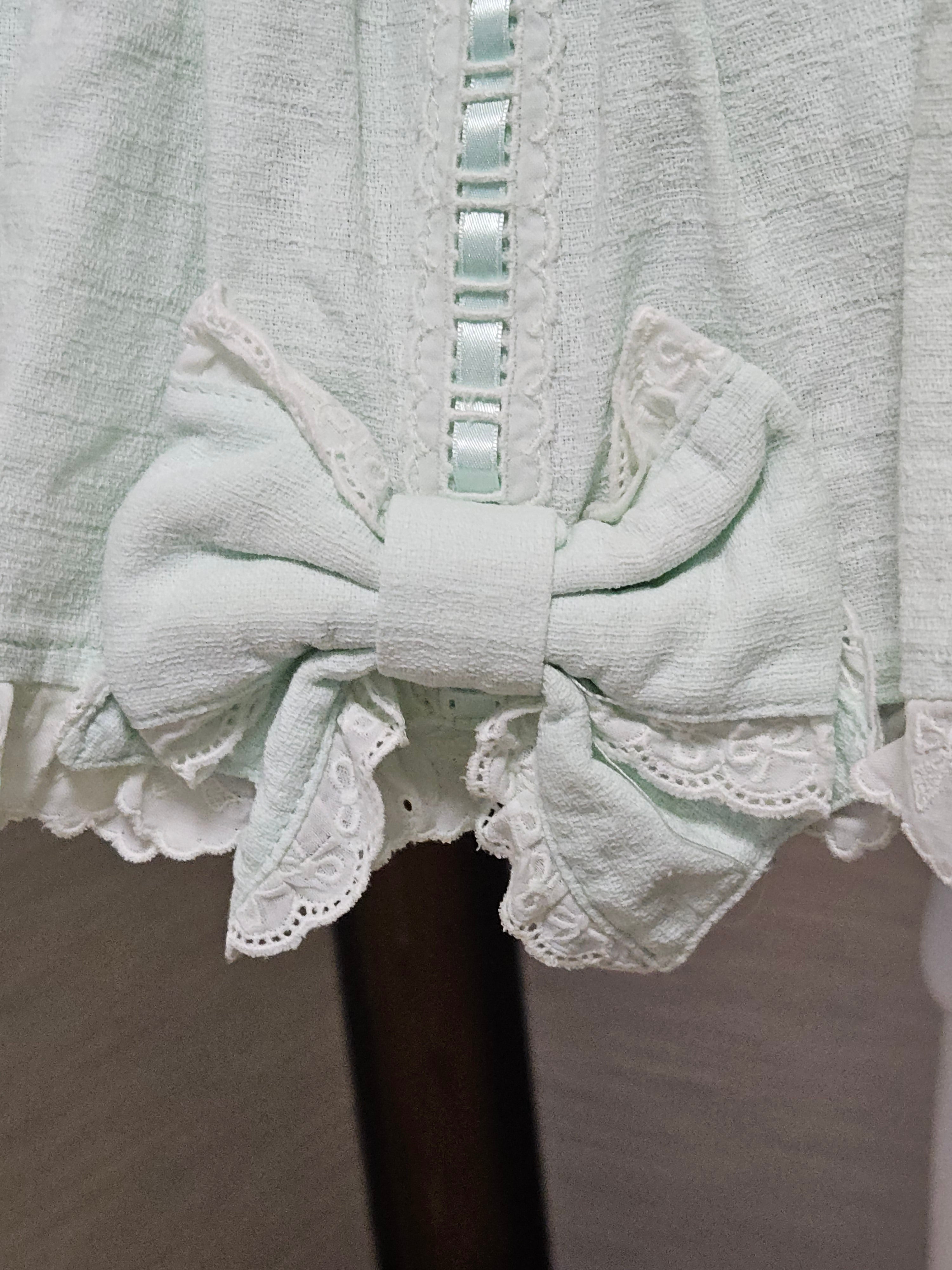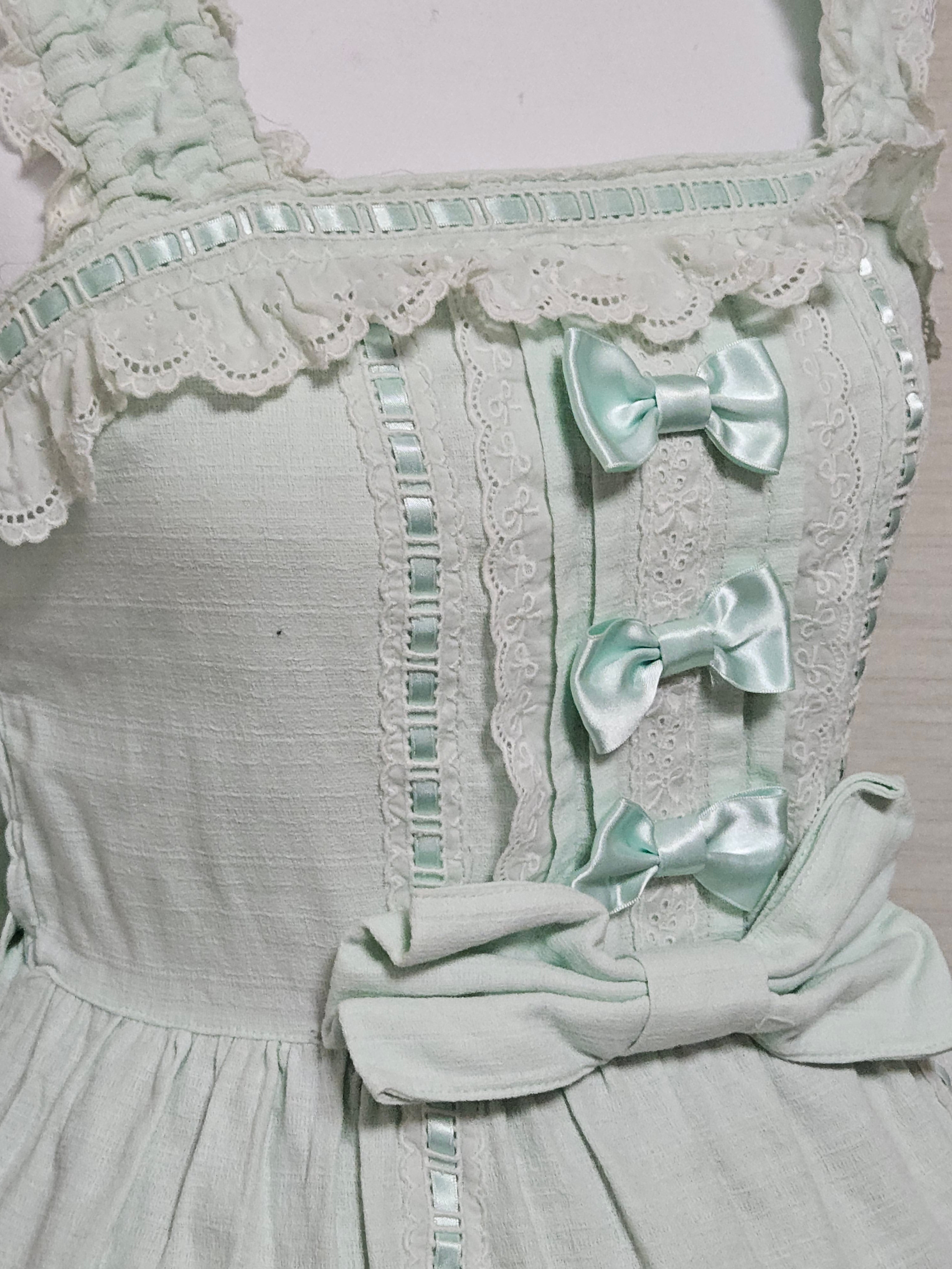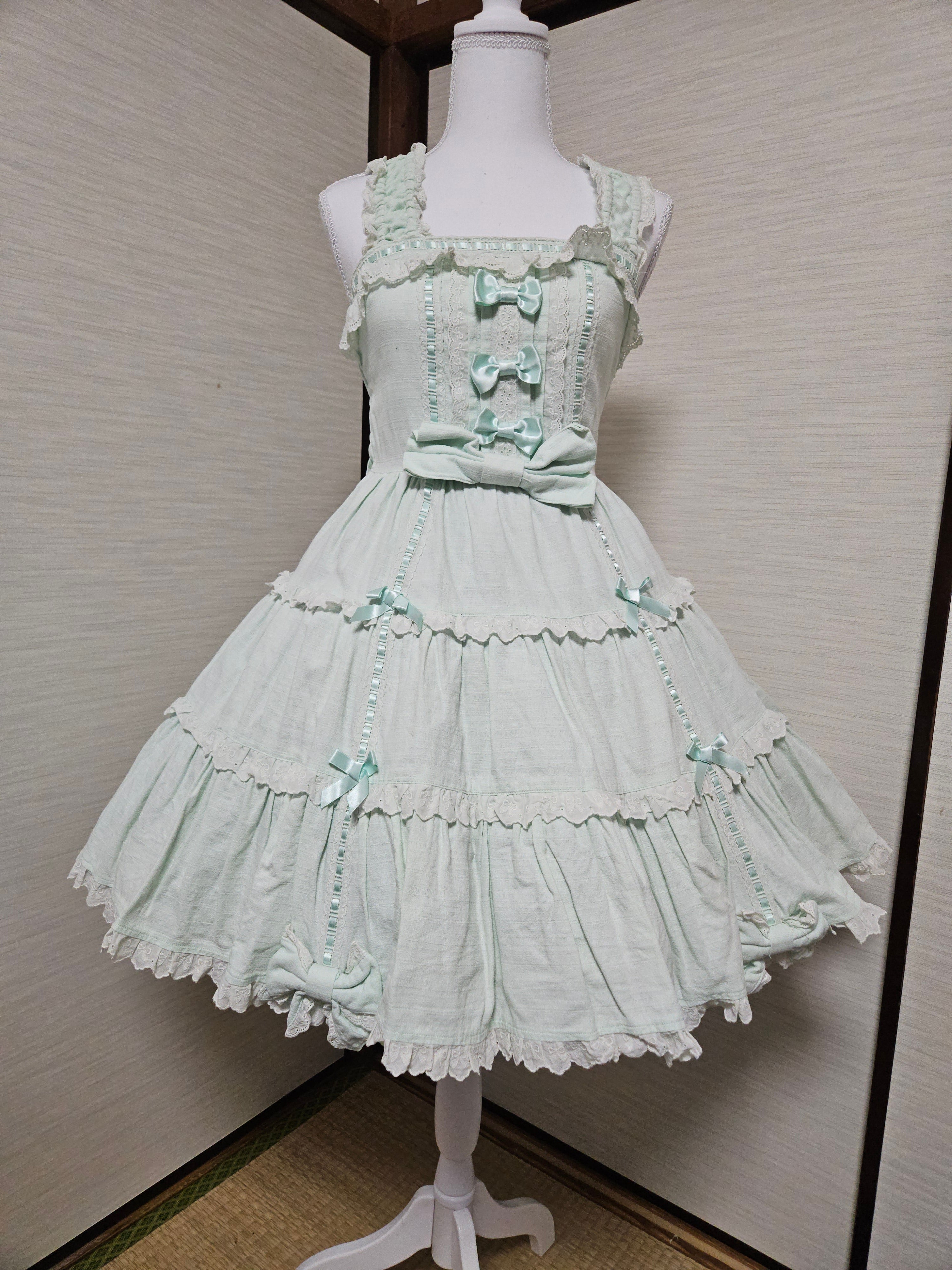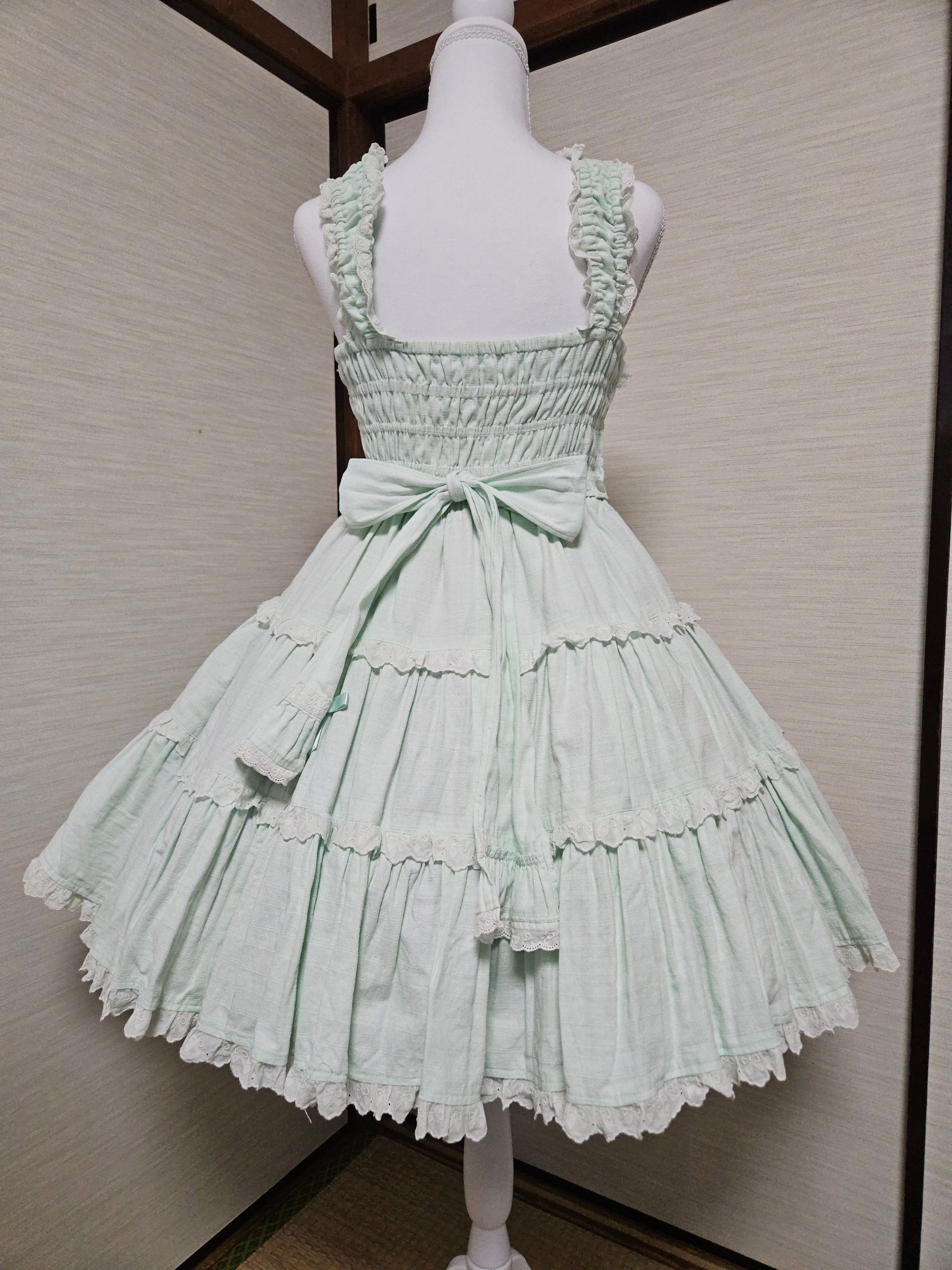 ♥Material♥ •Body: Baniran (100% cotton) ♥Lace♥ •Cotton lace ♥Other♥ •Satin ribbon •Back shirring offers limited ease of fitting. ♥Alternate Name♥ 82J1-2300 ファンシー肩リボンジャンパースカート Fancy Shoulder Ribbon JSK (it appeared this way on the Angelic Pretty Utsunomiya and Sendai shop blogs but as the other name in the online store)