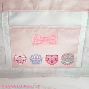 A tote bag with the original print Happy Cakes on it.