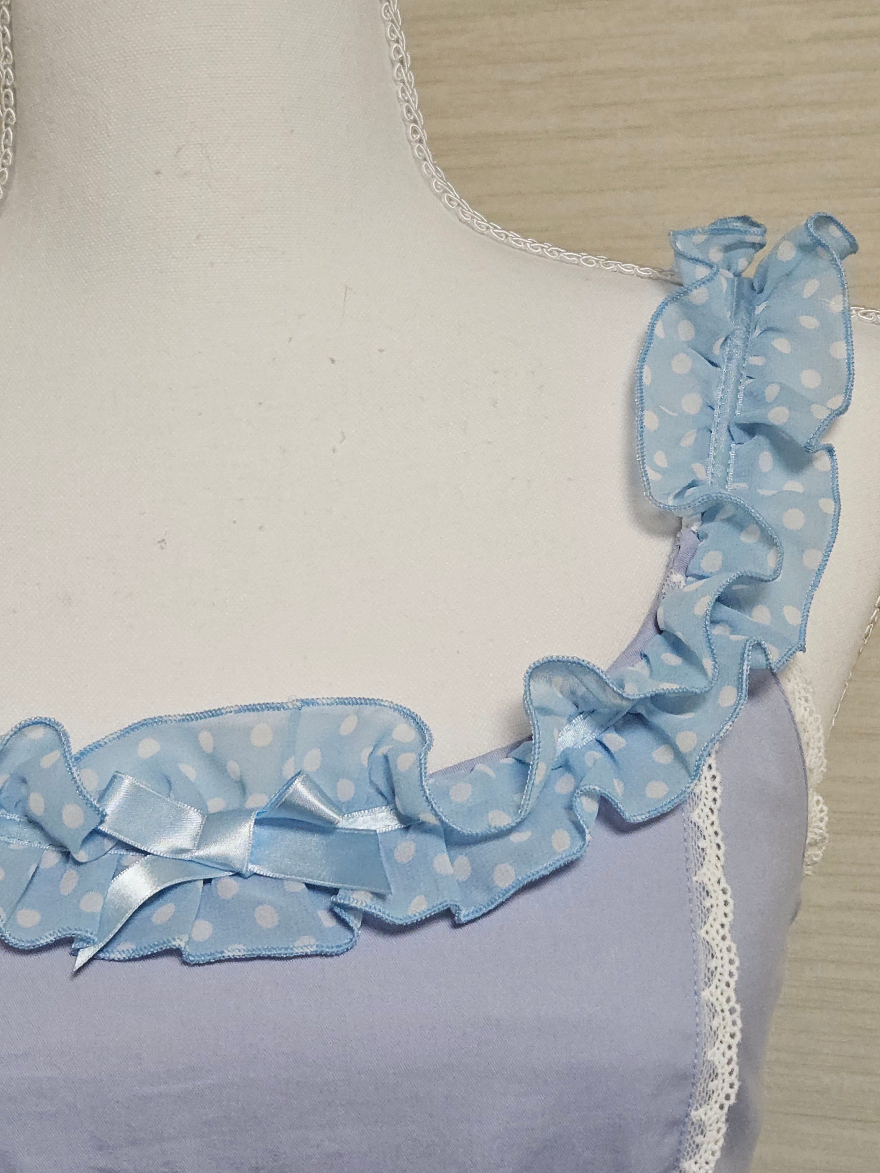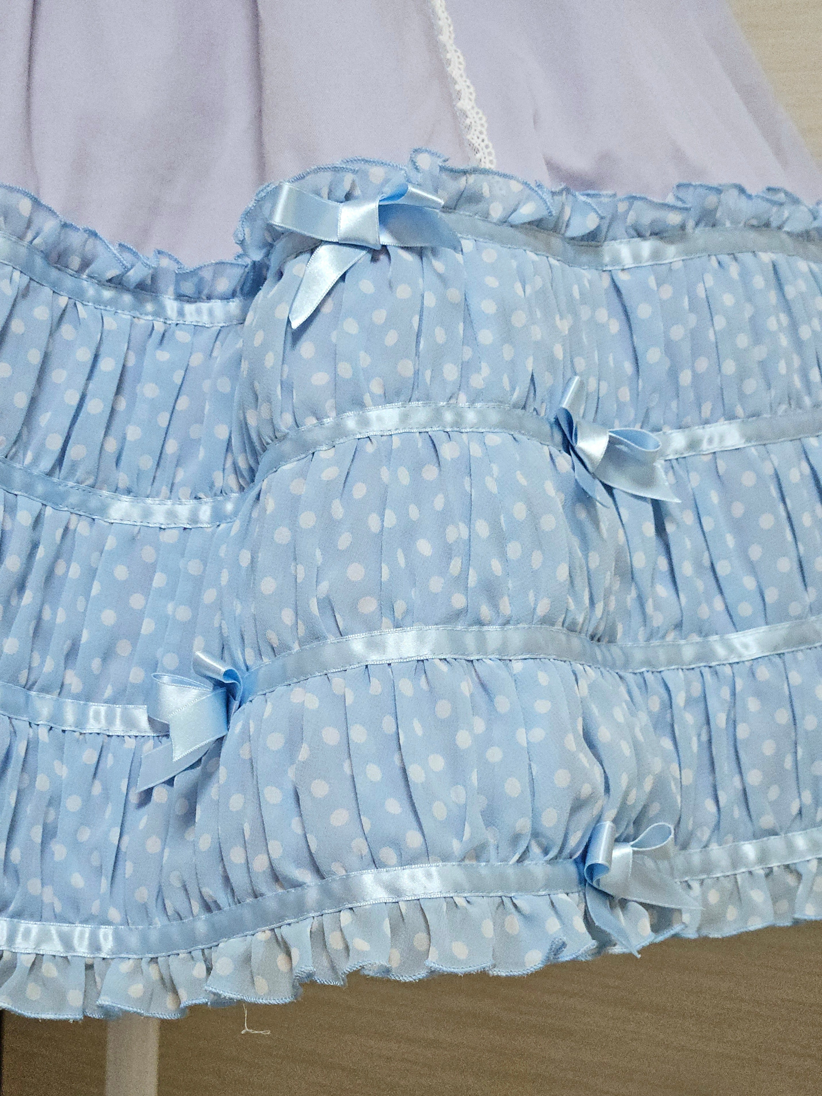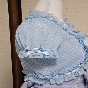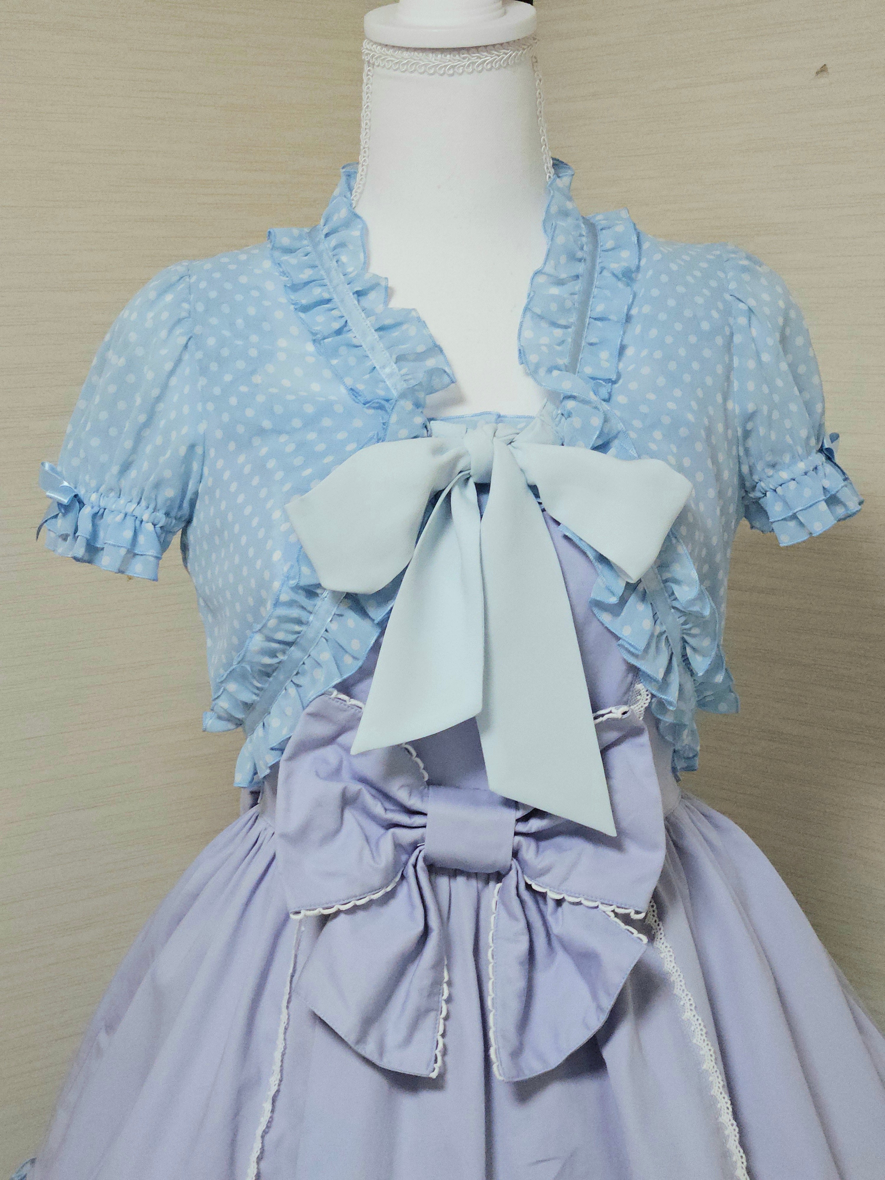 [Material] ·Body: Burberry (100% cotton) ·Other Fabric: Polkadot chiffon and plain chiffon (100% polyester) [Lace] ·Chemical lace ·Tulle lace [Other] ·Satin ribbon ·Elastiziced cuffs on bolero ·Partial shirring offers limited ease of fitting. [Bolero Measurements] ·Length: about 34.5cm ·Shoulder width: about 35cm ·Bust: about 92cm ·Sleeve Length: about 15.5cm ·Cuffs: about 28cm
