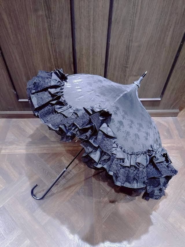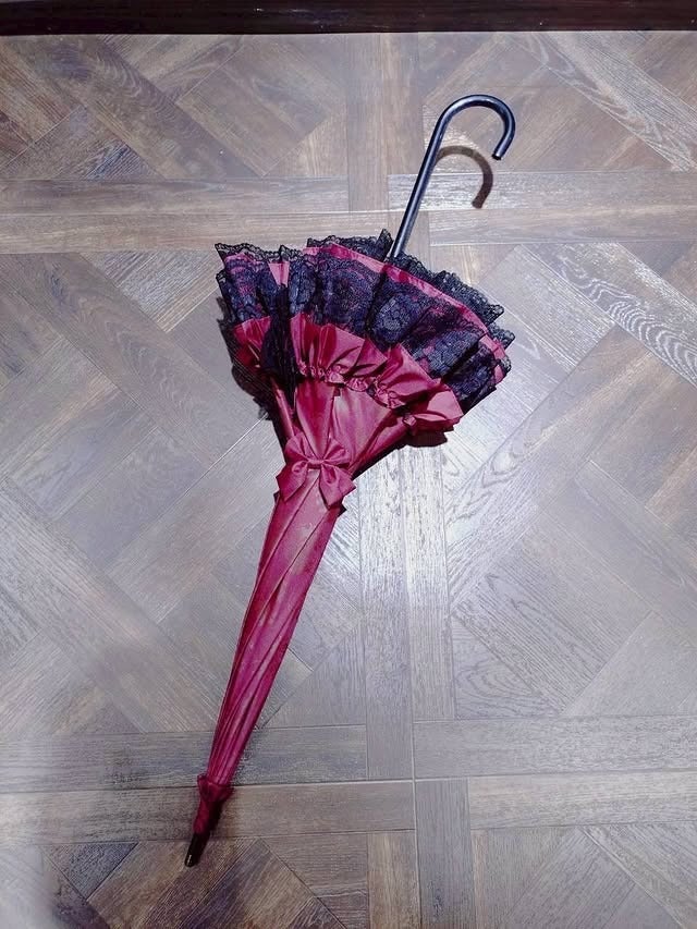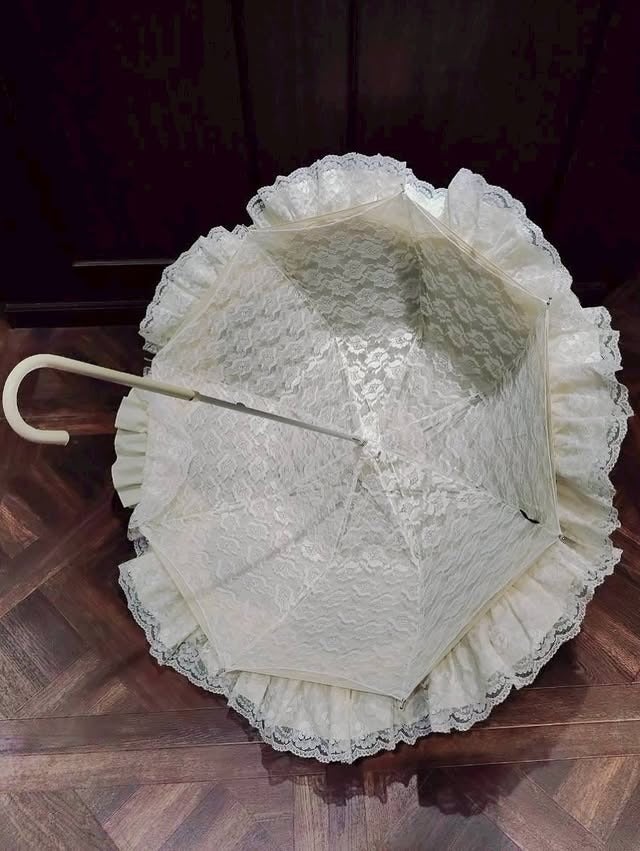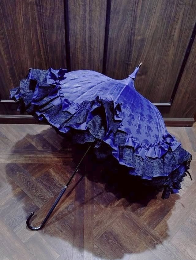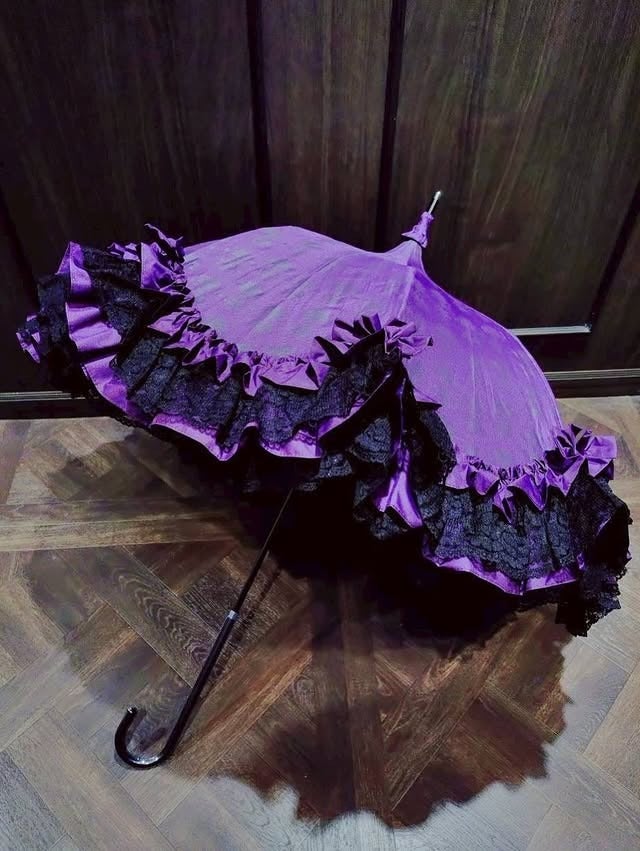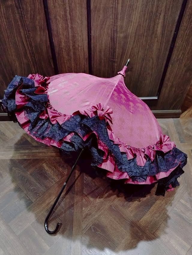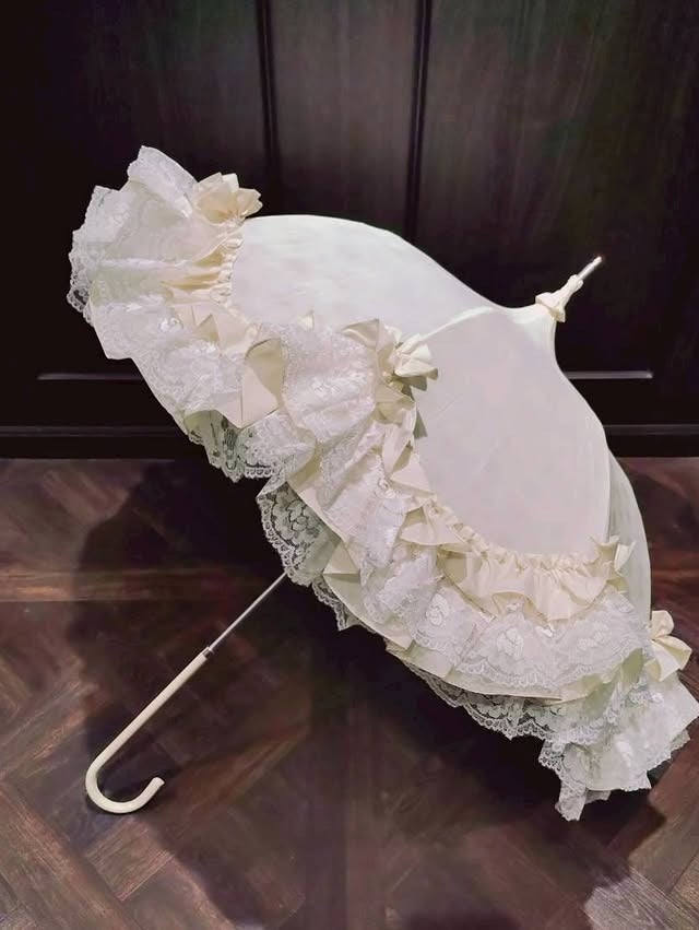 A new umbrella has arrived, adorned with ruffles, lace, and ribbons, resembling a bouquet! This one also has a pagoda shape.