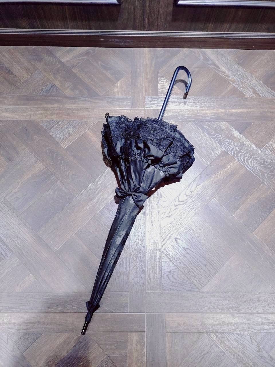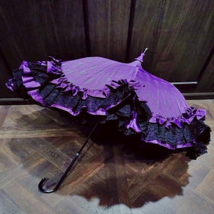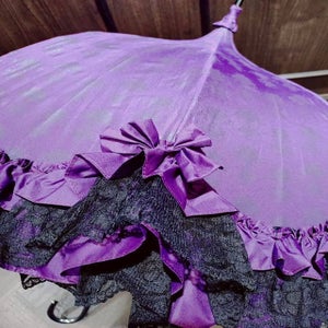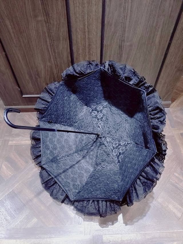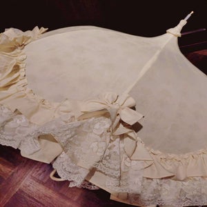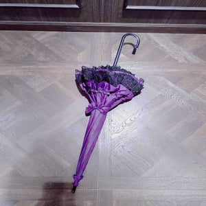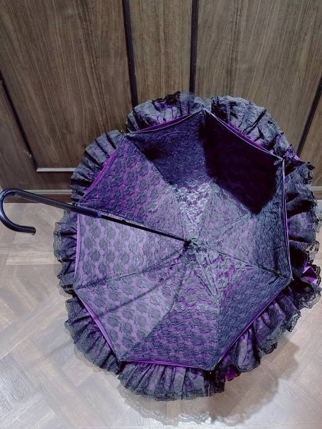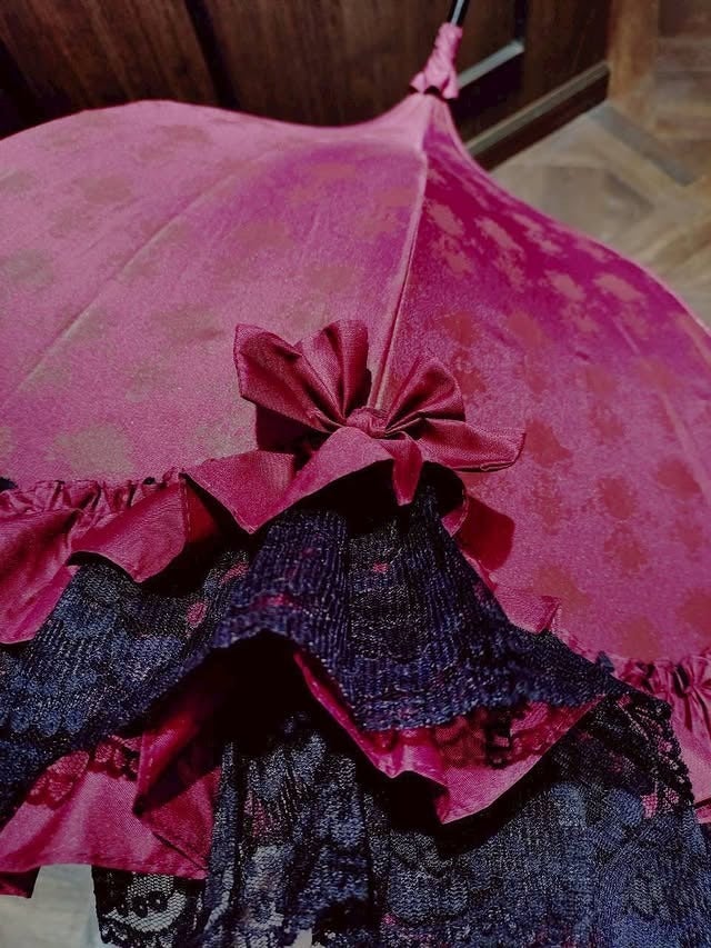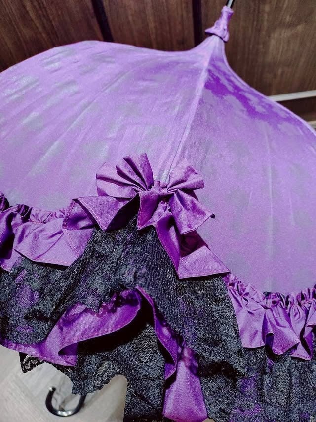 A new umbrella has arrived, adorned with ruffles, lace, and ribbons, resembling a bouquet! This one also has a pagoda shape.