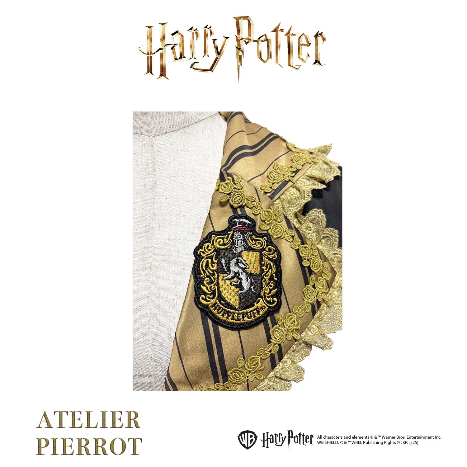 The house's signature colors are expressed in stripes, and the chest features an embroidered emblem.