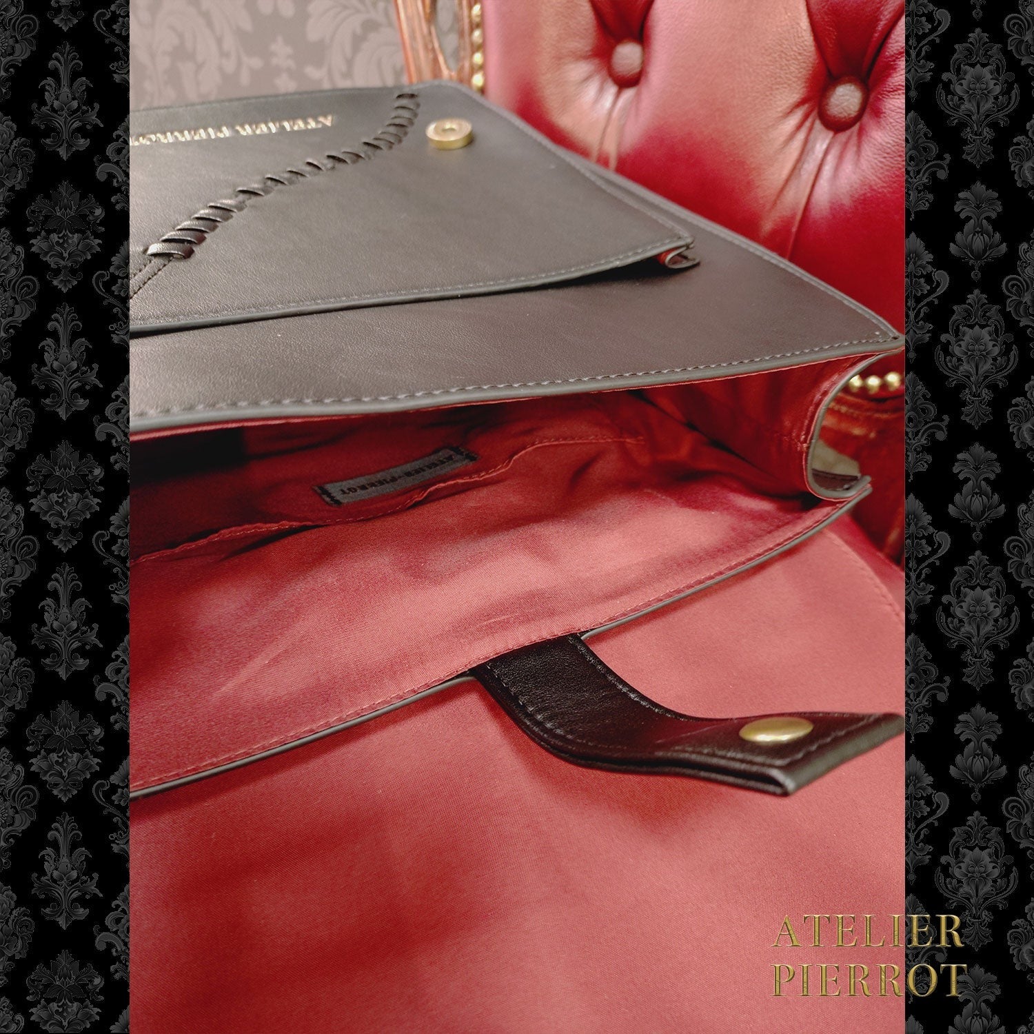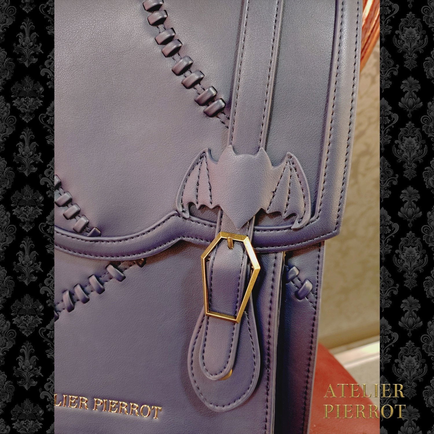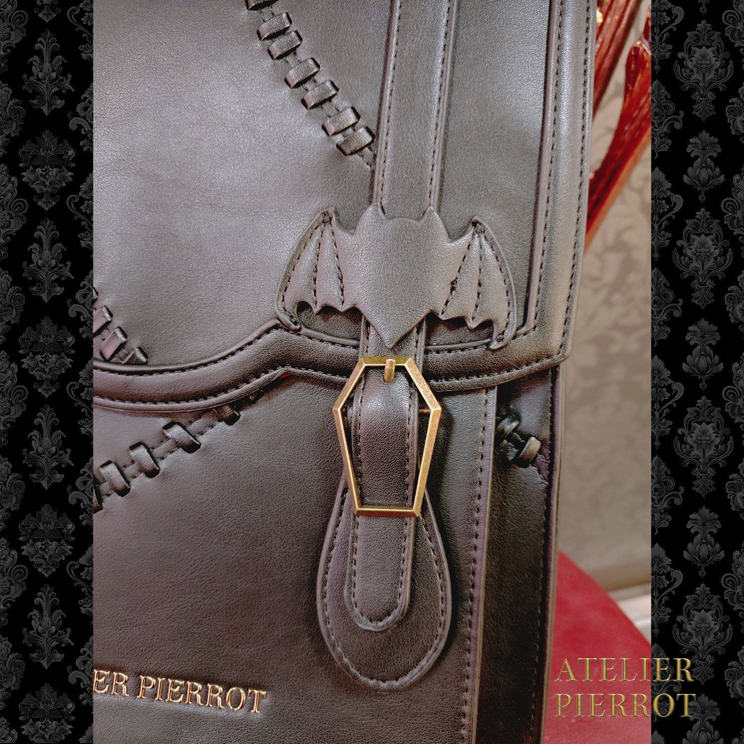 This bag has a gothic horror feel, with patchwork details and bat and coffin motifs scattered throughout .