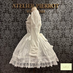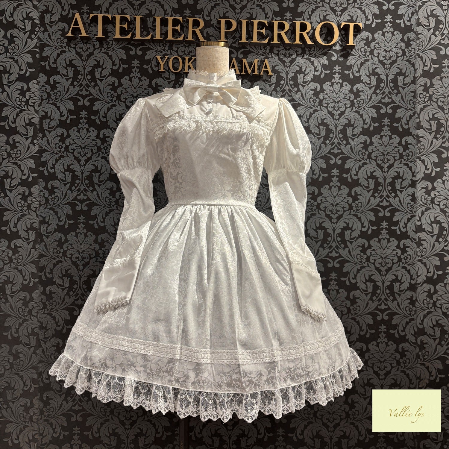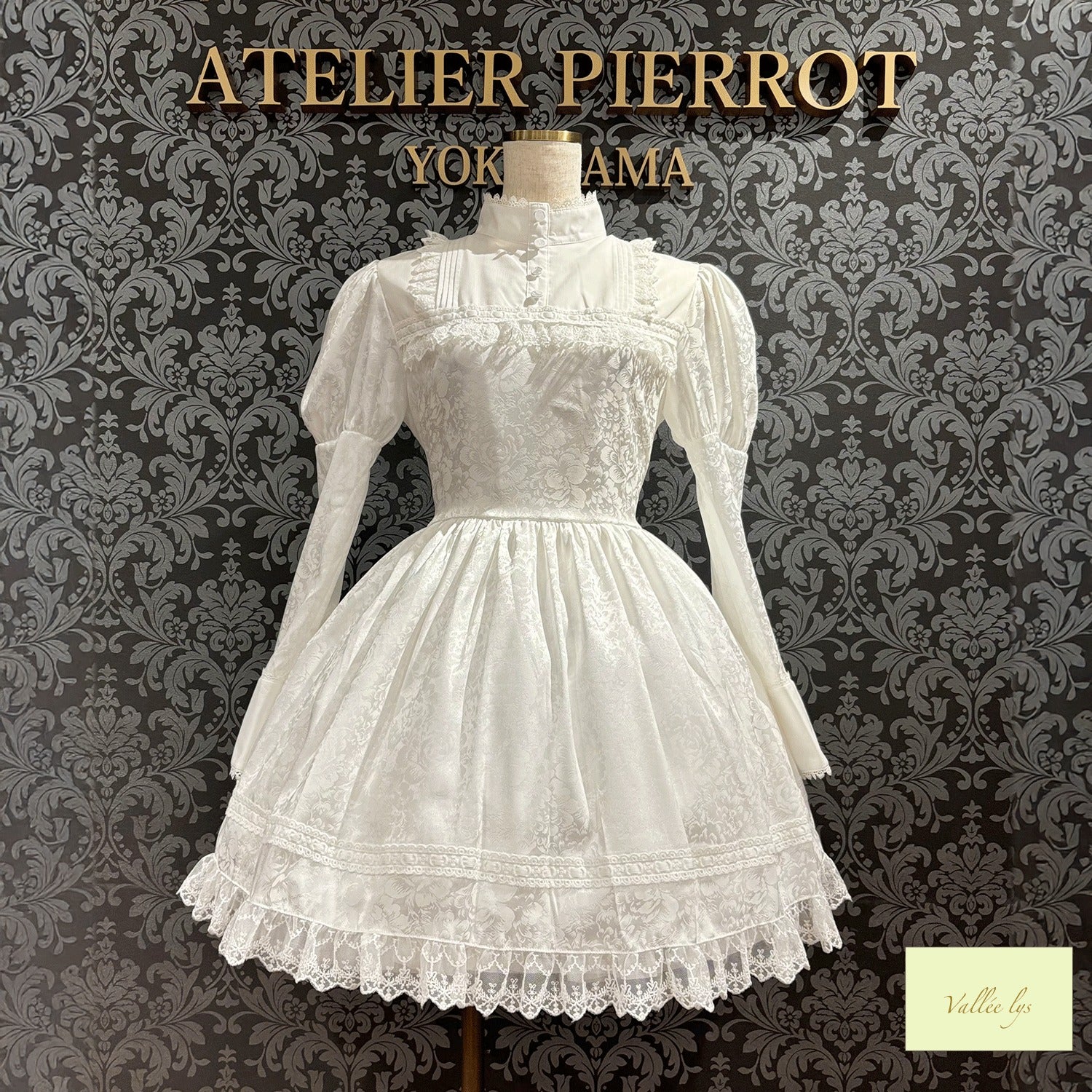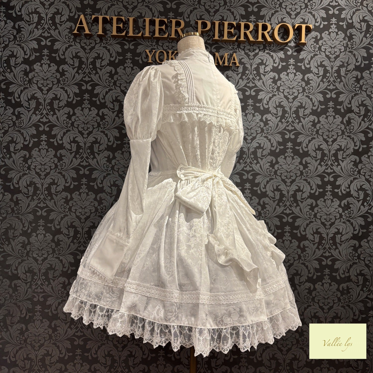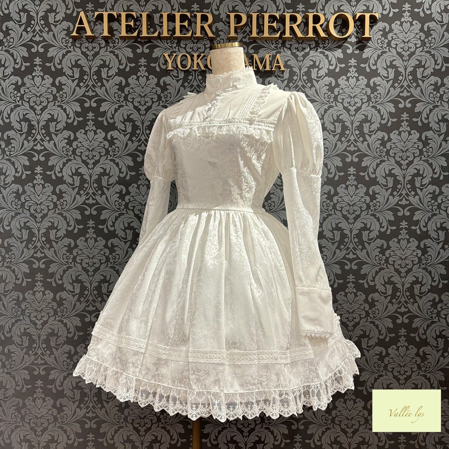 A mini dress decorated with delicate rose jacquard and ladder lace.