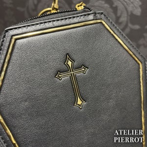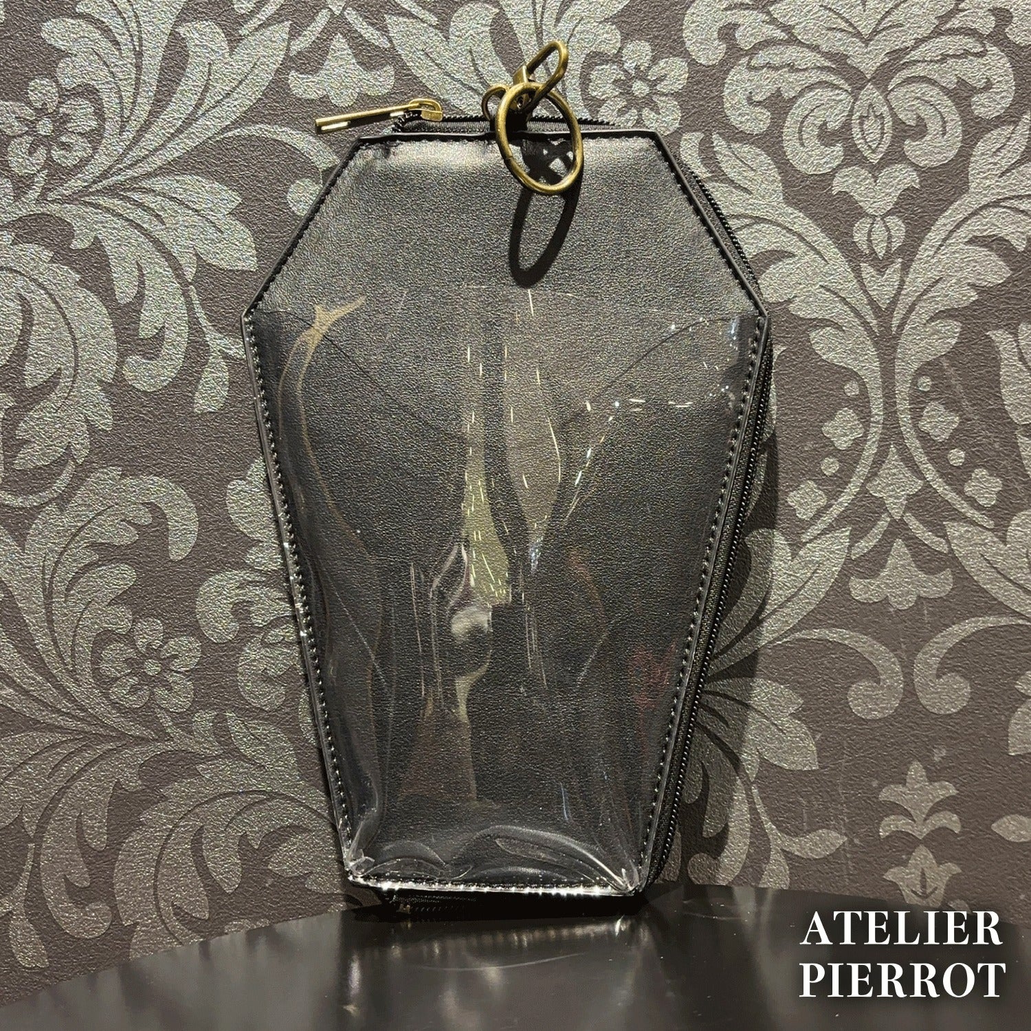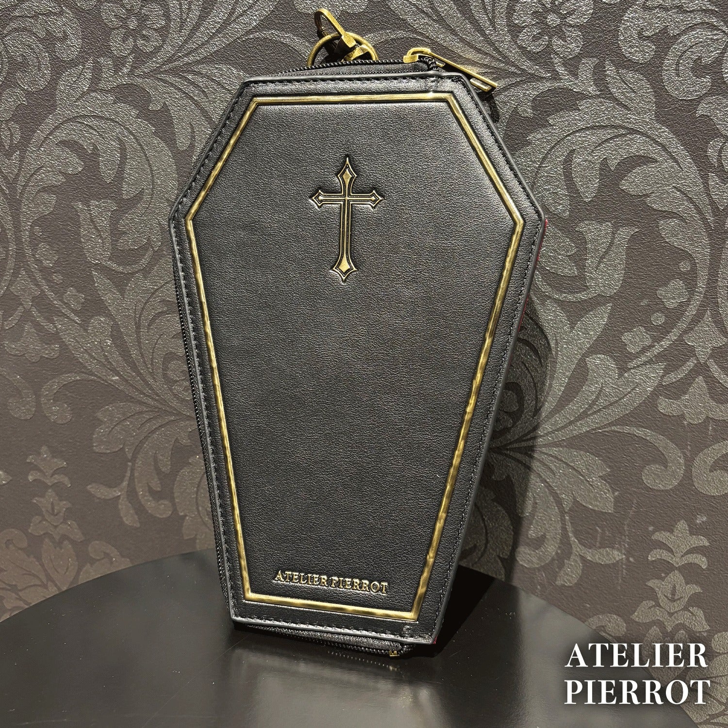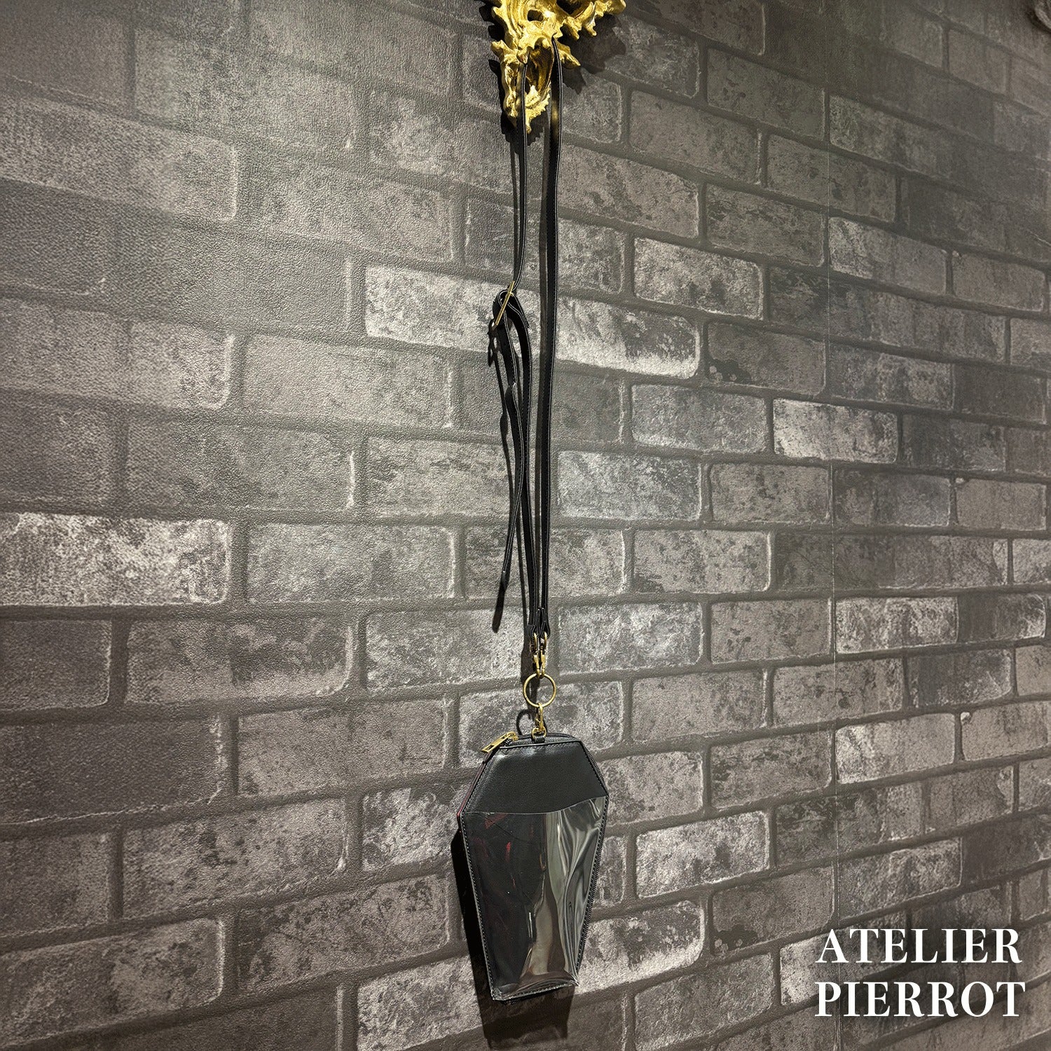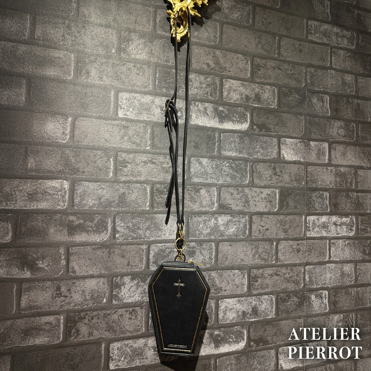 Introducing a coffin-shaped smartphone shoulder bag that's perfect for Gothic, Lolita, Prince style, and other Gothic Lolita fashion styles! Not only can you put your smartphone in the pocket on the back, but opening the zipper reveals a pocket where you can store cards, making this an extremely practical design.By connecting the pass cases, coin cases, and other items from the series to your liking, you can create your own unique pouch!