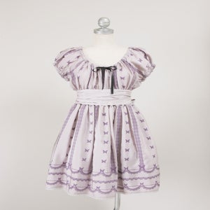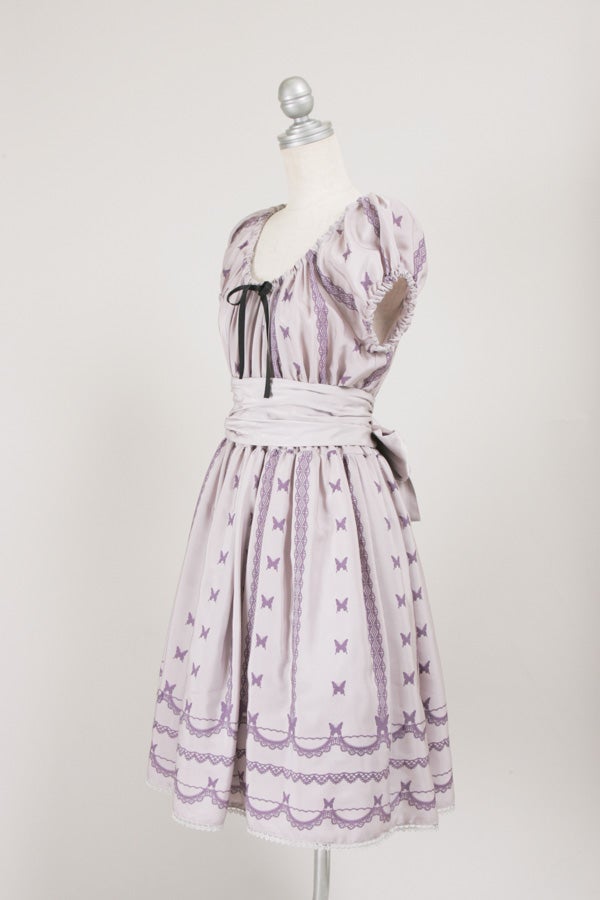 蝶とレース柄のプリントが全面に広がったデザインはオリジナル柄。ラインも綺麗できやすいゴムシャーリング仕様のワンピ。お好みでウエストにリボンを結べます。