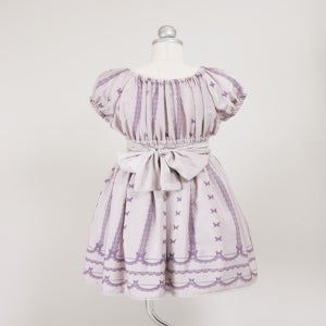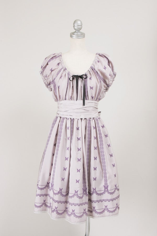 The dress features an original design with an all-over butterfly and lace print. It has elastic shirring for a beautiful line. You can tie a ribbon around the waist if you like.