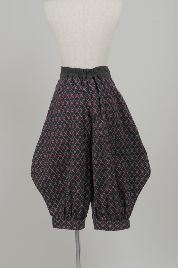 レトロなチェック柄と秋冬素材が暖かな印象。ウエストは別布のカバーでスッキリと。カバーはパンツ本体に付いています。