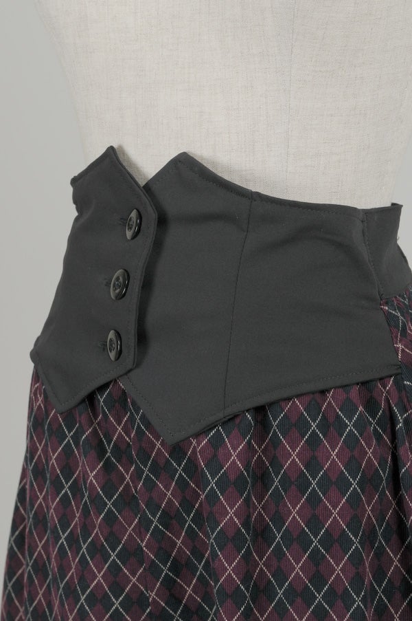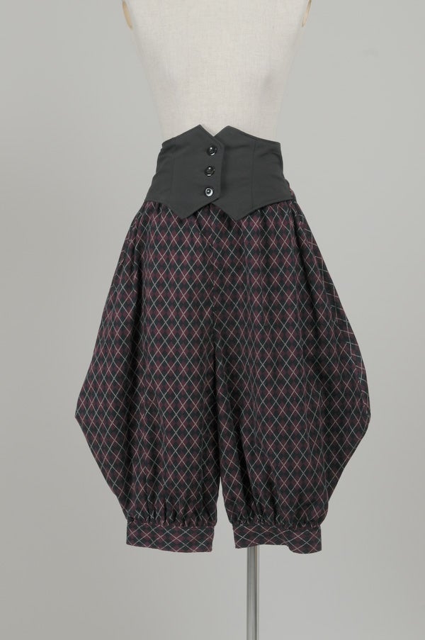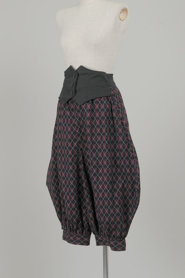 The retro check pattern and autumn/winter material create a warm impression. The waist is covered with a separate fabric cover, which is attached to the pants themselves