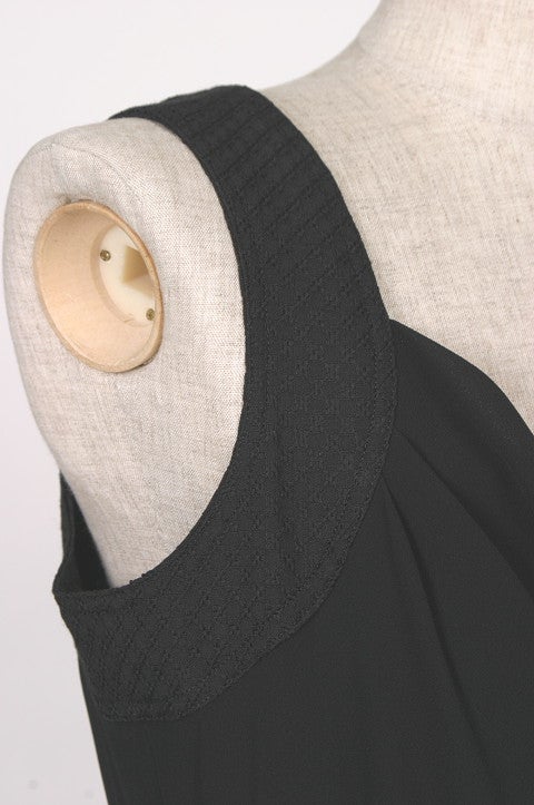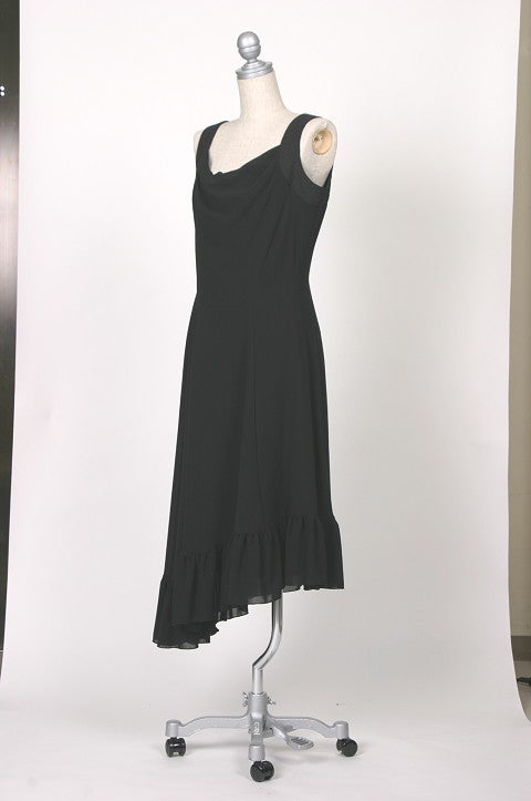 シンプルなノースリワンピースは年間使えるアイテムです。裾のデザインで足元もきれいに映えます。