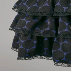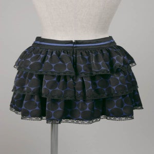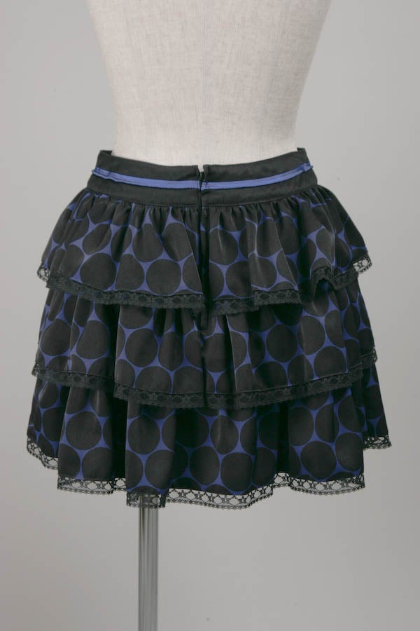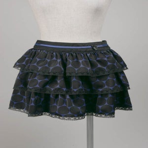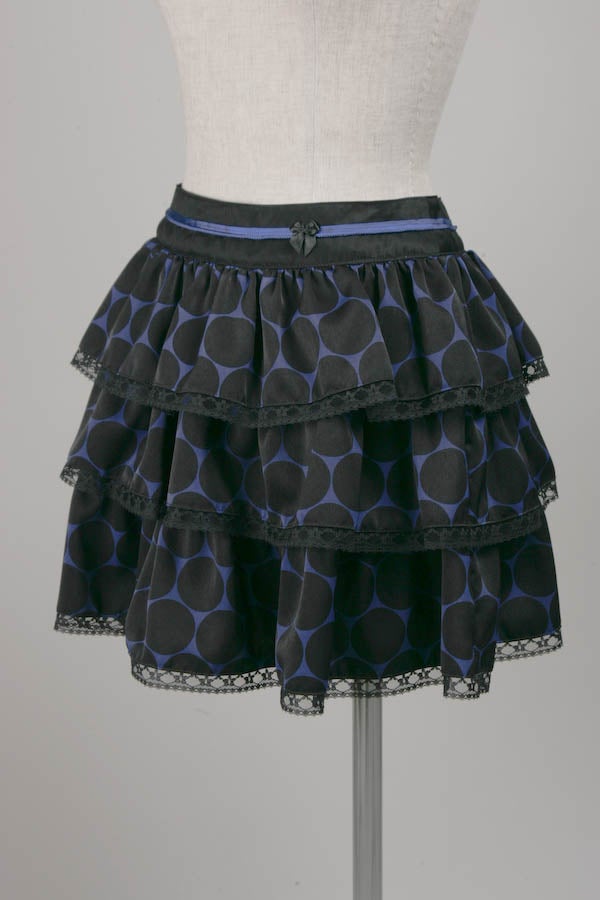 A blue and black large dot skirt with a ribbon accent at the waist. It can also be coordinated with a blouse.