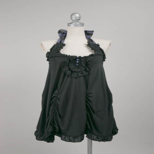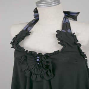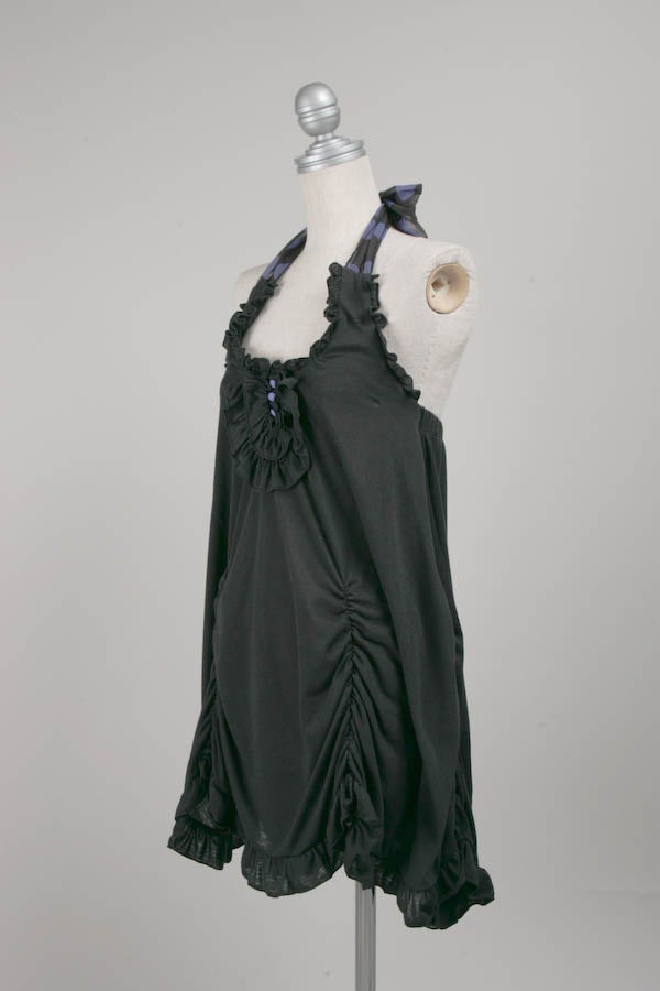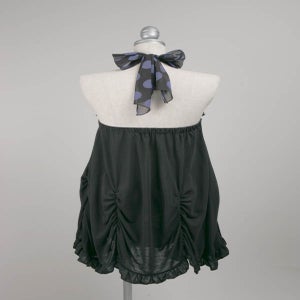 ホルターのリボンはドットのシフォン生地を使用。ドレープが素敵なチュニック。青の指し色が効いています。