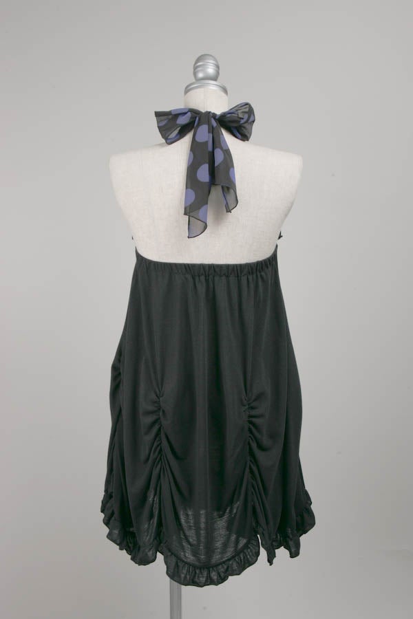 The halter ribbon is made of dotted chiffon fabric. This tunic has a lovely drape. The blue accents add a nice touch