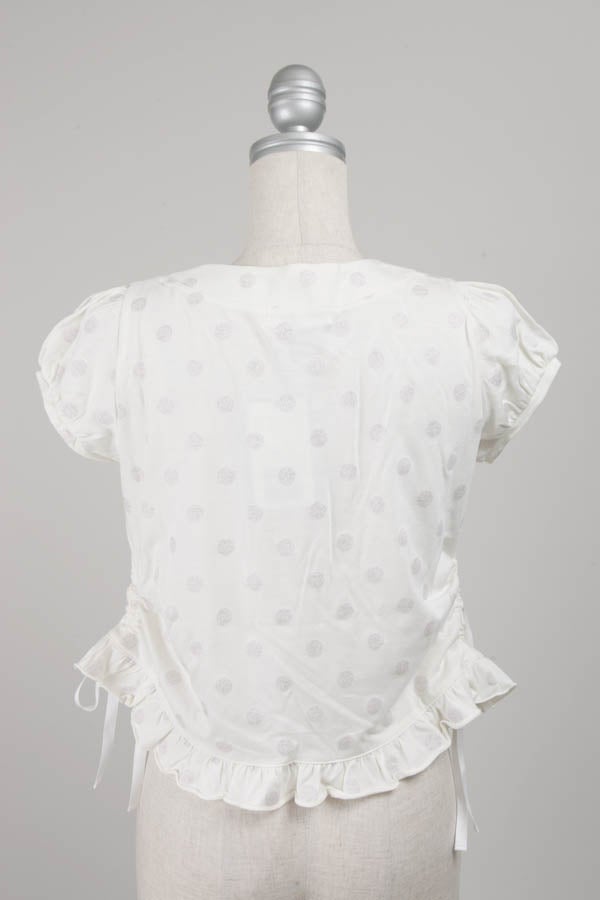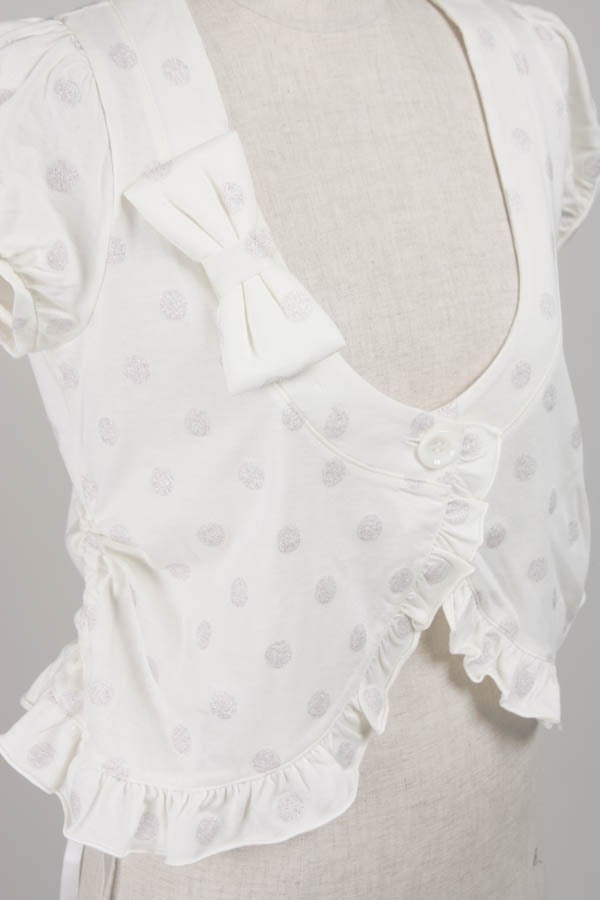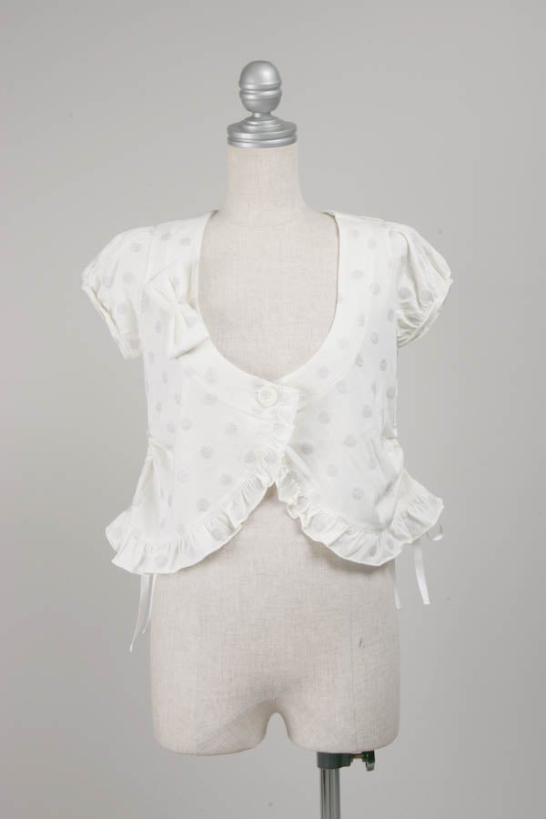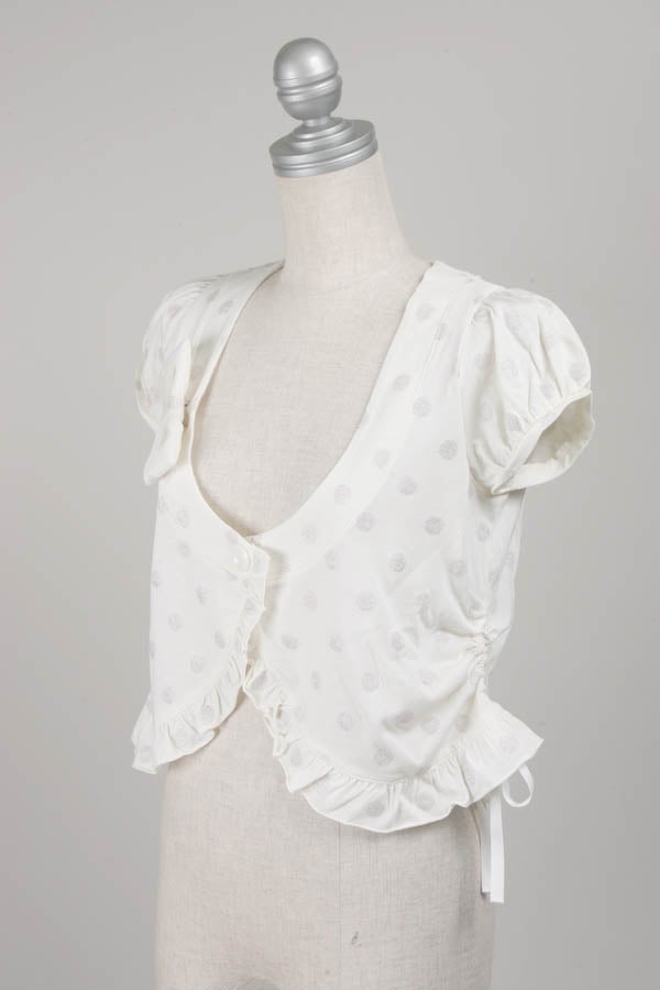 ラメラメドットとおりぼんがキュートなボレロ。クリーム×ピンクの組み合わせが乙女。サイドの裾シャーリングでアレンジ可能。